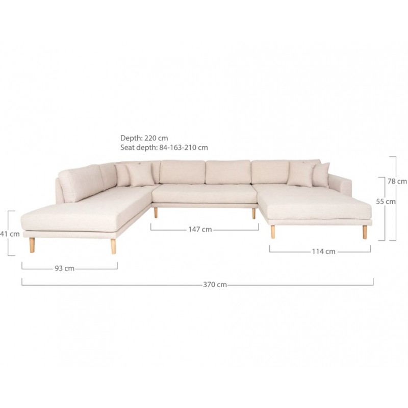 Narożnik LIDO U to nowoczesny mebel wypoczynkowy zaprojektowany z myślą o dużych, przestronnych wnętrzach. Jego imponujący kształt oraz układ w kształcie litery U nie tylko zapewnia wyjątkowy komfort użytkowania, ale również stanowi stylowe uzupełnienie każdego salonu, stając się jego centralnym punktem. Narożnik został otapicerowany modną plecioną strukturalną tkaniną w kolorze beżowym, która nie tylko pięknie się prezentuje, ale również wprowadza do wnętrza przytulność i elegancję. Charakterystyczne dekoracyjne przeszycia w formie bąbelkowego wzoru nadają mu oryginalnego, a zarazem wyrafinowanego wyglądu, doskonale wpisując się w nowoczesne aranżacje. Wysoki komfort użytkowania zapewniają poduszki oparciowe oraz szerokie siedziska wypełnione pianką wysokoelastyczną, która gwarantuje optymalne podparcie i wygodę podczas codziennego wypoczynku. Stabilną konstrukcje wykonano z drewna bukowego, którą dopełniają eleganckie, drewniane nogi gwarantujące trwałość i estetyczny wygląd. Dwie leżanki o różnych rozmiarach umożliwiają swobodne dopasowanie do indywidualnych potrzeb użytkownika, czyniąc mebel idealnym rozwiązaniem zarówno do codziennego wypoczynku, jak i spotkań w większym gronie. Narożnik LIDO U to bez wątpienia idealne połączenie elegancji, solidnego wykonania i funkcjonalności, które doskonale wpisuje się zarówno w nowoczesne, jak i klasyczne wnętrze.