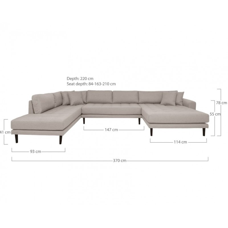 Narożnik LIDO U to nowoczesny mebel wypoczynkowy zaprojektowany z myślą o dużych, przestronnych wnętrzach. Jego imponujący kształt oraz układ w kształcie litery U nie tylko zapewnia wyjątkowy komfort użytkowania, ale również stanowi stylowe uzupełnienie każdego salonu, stając się jego centralnym punktem. Narożnik został otapicerowany modną plecioną strukturalną tkaniną w kolorze szarym, która nie tylko pięknie się prezentuje, ale również wprowadza do wnętrza przytulność i elegancję. Charakterystyczne dekoracyjne przeszycia w formie bąbelkowego wzoru nadają mu oryginalnego, a zarazem wyrafinowanego wyglądu, doskonale wpisując się w nowoczesne aranżacje. Wysoki komfort użytkowania zapewniają poduszki oparciowe oraz szerokie siedziska wypełnione pianką wysokoelastyczną, która gwarantuje optymalne podparcie i wygodę podczas codziennego wypoczynku. Stabilną konstrukcje wykonano z drewna bukowego, którą dopełniają eleganckie, drewniane nogi gwarantujące trwałość i estetyczny wygląd. Dwie leżanki o różnych rozmiarach umożliwiają swobodne dopasowanie do indywidualnych potrzeb użytkownika, czyniąc mebel idealnym rozwiązaniem zarówno do codziennego wypoczynku, jak i spotkań w większym gronie. Narożnik LIDO U to bez wątpienia idealne połączenie elegancji, solidnego wykonania i funkcjonalności, które doskonale wpisuje się zarówno w nowoczesne, jak i klasyczne wnętrze.