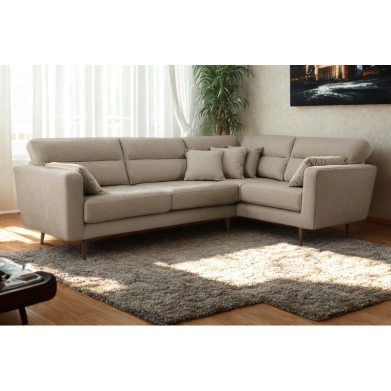 Stylowy i komfortowy narożnik, który doskonale wpasuje się w każde wnętrze. Jego nowoczesny design podkreślają subtelne przeszycia, wysokie smukłe nogi oraz eleganckie poduszki, które nadają mu wyjątkowy charakter. To idealne rozwiązanie zarówno do przestronnych salonów, jak i przytulnych mieszkań.