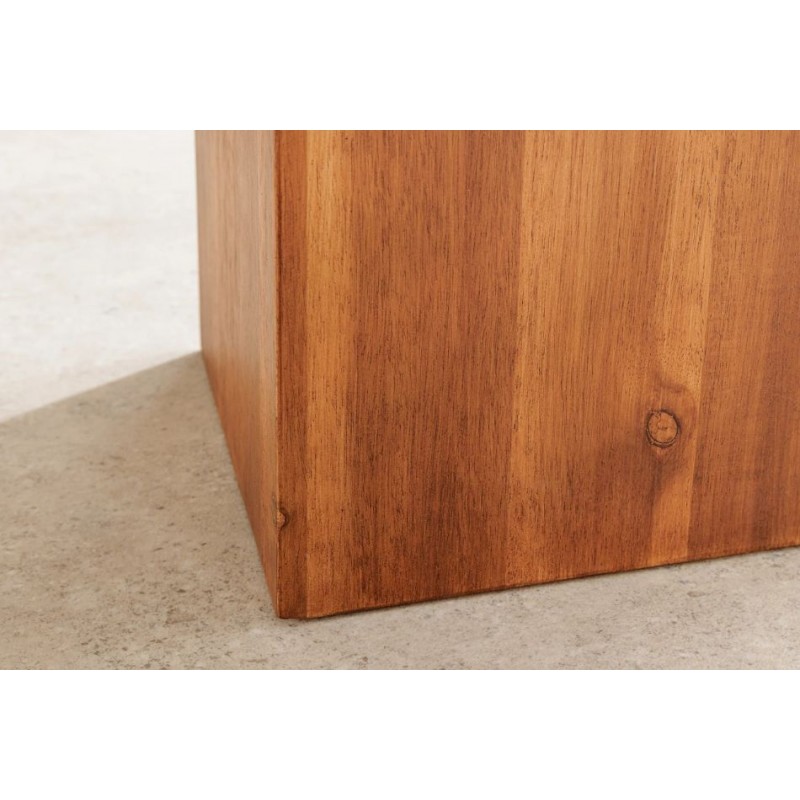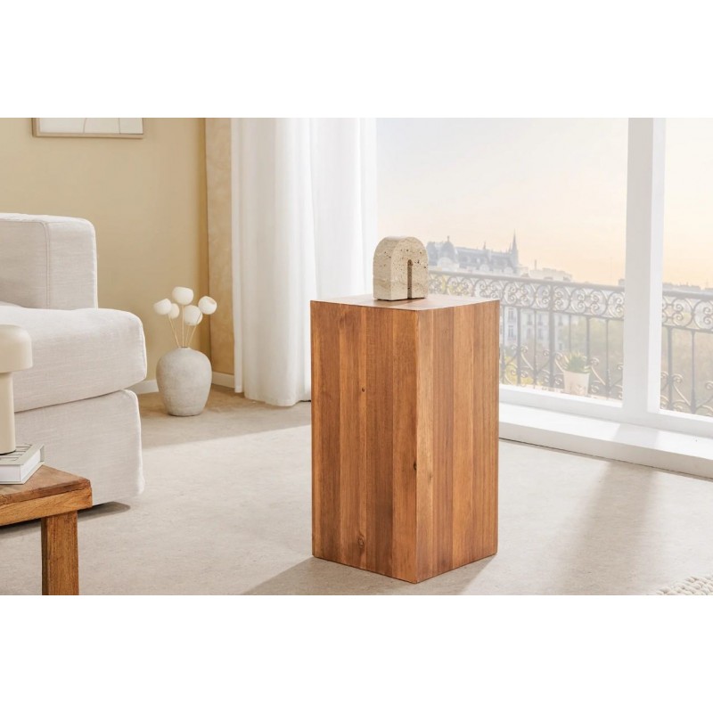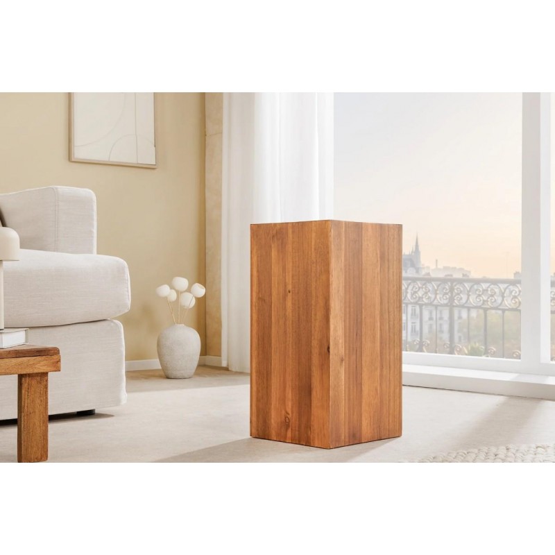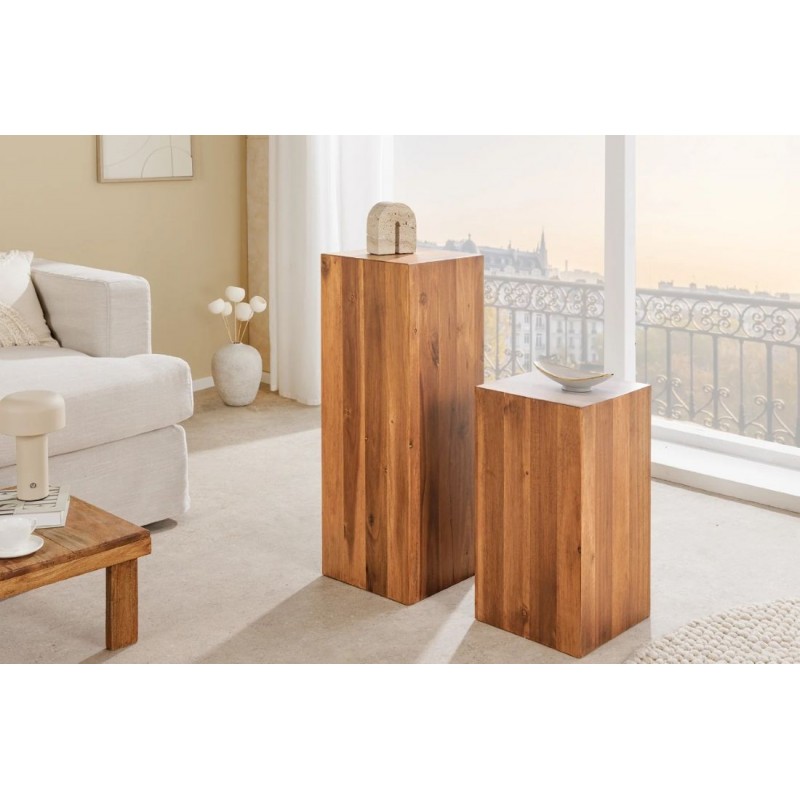 Ta nietuzinkowa dekoracja w formie kolumny to idealny dodatek pasujący do każdego salonu w stylu nowoczesnym, gdzie dzięki swojej ciekawej formie wprowadzą do wnętrza niesamowitego charakteru oraz stylu. Wykonana została ręcznie z litego drewna akacji w odcieniu brązowym, który dzięki zachowaniu oryginalności słojów oraz sęków drewna sprawia, że jeszcze bardziej została uwydatniona ich naturalność drzewa. Dzięki precyzyjnemu wykonaniu oraz dbałości o detale, SAULE stanowi dopełnienie nowoczesnych aranżacji wnętrz. Naturalne piękno drewna oraz funkcjonalna konstrukcja sprawiają, że łączy w sobie estetykę i praktyczność, ponadto bez wątpienia jest to znakomity wybór dla osób ceniących oryginalne, stylowe i trwałe meble, które doskonale odnajdują się w salonach urządzonych w stylu nowoczesnym, rustykalnym czy boho.