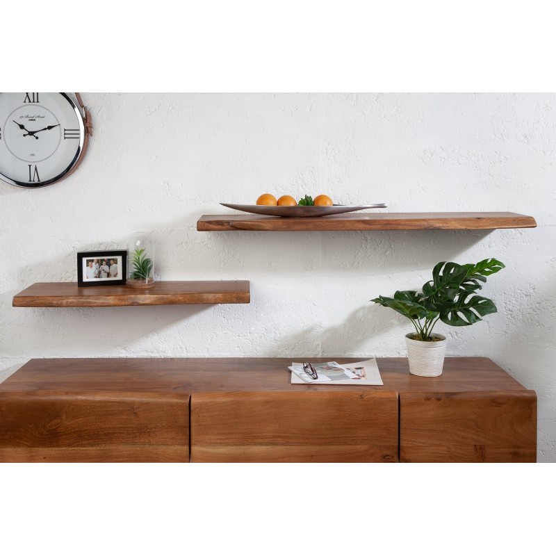 ZESTAW 3 PÓŁEK ŚCIENNYCH BASTIAN AKACJA Półki ścienne do salonu, biura lub sypialni wykonane zostały z drewna akacja. Zachowany naturalny kształt drzewa nadaje oryginalny design. Zestaw składa się z trzech półek o szerokości 60 cm i głębokości ok: 9 - 13 cm. Nlhome to meble, oświetlenie i akcesoria wnętrzarskie produkcji holenderskiej. Marka działa już na...