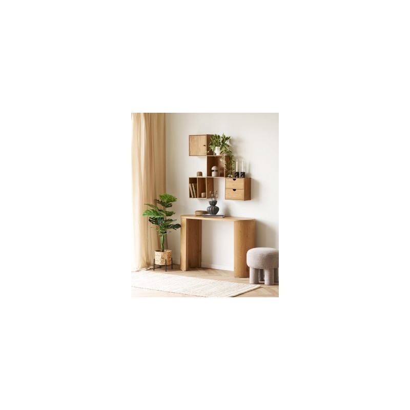 SZAFKA ŚCIENNA ENES 50 CM Ta „okrągła”, wisząca szafka ścienna została wykonana z wytrzymałego, solidnego drewna. W połączeniu z czarną piaskowaną ramą tworzy designerską i nowoczesną kompozycję. Aby stworzyć ten produkt bardziej funkcjonalnym, w środku umieszczono niewielką szufladę. Szafka ENES jest dostępna również w dwóch innych rozmiarach. Produkty...