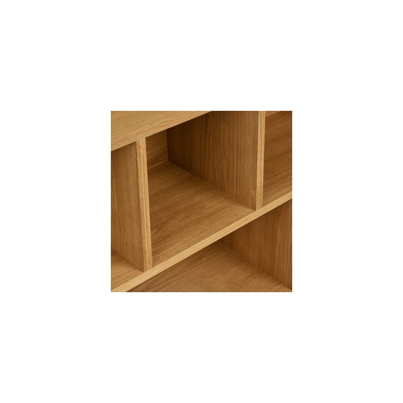 REGAŁ SEAFORD DZIKI DĄB Przestrzenny, asymetryczny regał wykonany z metalowej ramy oraz okleiny w kolorze dzikiego dębu. Doskonale sprawdzi się na książki, kwiaty, ozdoby bądź inne przedmioty codziennego użytku. Regał należy do serii SEAFORD, która obejmuje również inne regały na książki, stoły, stoliki kawowe, stoliki barowe i kredensy.