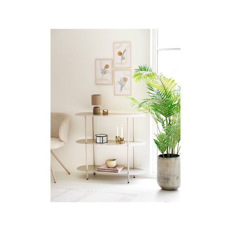 Regał z trzema półkami o wymiarach 31 × 90 × 81 cm to praktyczne i stylowe rozwiązanie do nowoczesnych wnętrz. Wykonany z metalu i wykończony w subtelnym, piaskowym kolorze, charakteryzuje się minimalistyczną formą i lekką wizualnie konstrukcją. Otwarty układ trzech półek zapewnia funkcjonalną przestrzeń do przechowywania oraz ekspozycji książek, dekoracji czy roślin, jednocześnie nie dominując aranżacji. Prosta, geometryczna linia regału sprawia, że doskonale odnajdzie się w nowoczesnych, loftowych i skandynawskich wnętrzach, stanowiąc estetyczne i praktyczne uzupełnienie salonu, biura lub sypialni.