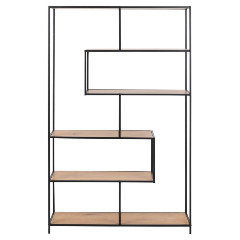 REGAŁ SEAFORD DZIKI DĄB Przestrzenny, asymetryczny regał wykonany z metalowej ramy oraz okleiny w kolorze dzikiego dębu. Doskonale sprawdzi się na książki, kwiaty, ozdoby bądź inne przedmioty codziennego użytku. Regał należy do serii SEAFORD, która obejmuje również inne regały na książki, stoły, stoliki kawowe, stoliki barowe i kredensy.