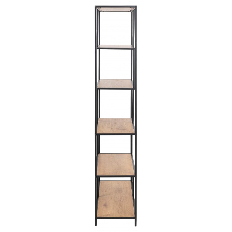 REGAŁ SEAFORD 77X150 CM DZIKI DĄB Nowocześnie wykonany regał metalowy, z pięcioma półkami dobrze sprawdzi się jako przestronny mebel w nowoczesnym mieszkaniu. Półki wykonane zostały z okleiny w kolorze dzikiego dębu, natomiast podstawę stanowi rama metalowa.