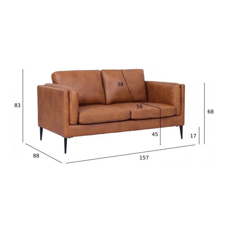 Sofa wspiera się na eleganckich metalowych nogach w kolorze czarnym, które nadają jej lekkości i jednocześnie zapewniają solidną stabilność. Wysokość siedziska 45 cm gwarantuje wygodną pozycję podczas siedzenia, a przemyślane wymiary 88 × 157 × 83 cm sprawiają, że model świetnie pasuje zarówno do większych, jak i mniejszych salonów.