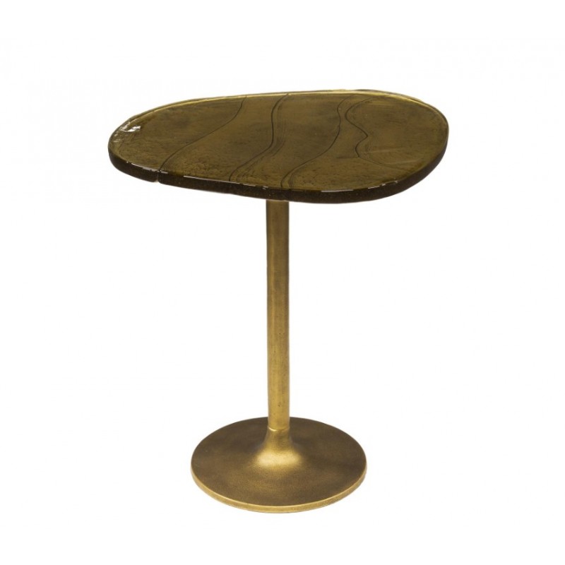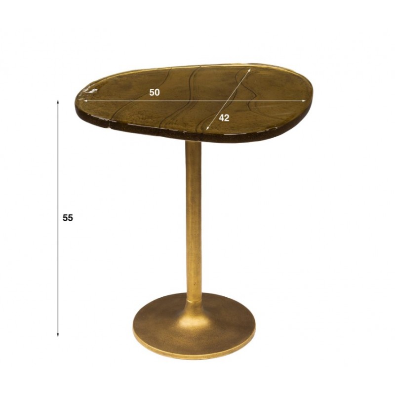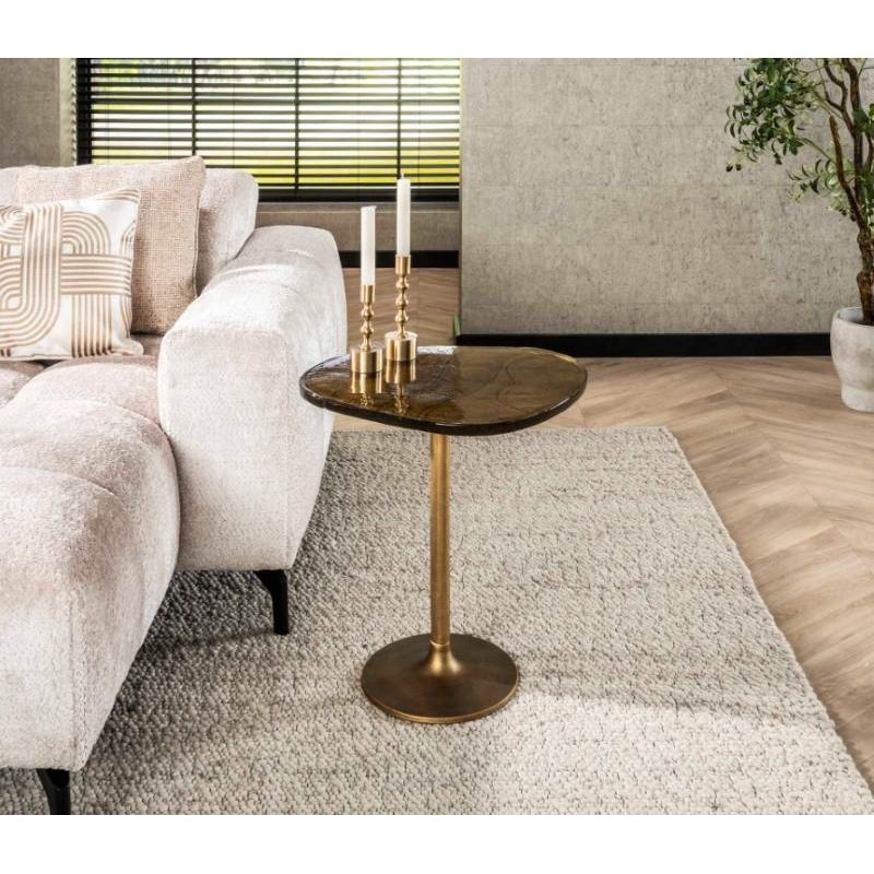 Stolik kawowy KIKO to idealne rozwiązanie dla miłośników elegancji i ciekawych form. Ten nietuzinkowy mebel dzięki swoim kształtom i nietypowej strukturze wprowadzi do pomieszczenia niesamowity styl przykuwając uwagę każdego. Blat osadzony został na metalowej podstawie w odcieniu złota idealnie dopasowanej do kolorystyki blatu. Głównym jego elementem jest ręcznie robiony blat o wyjątkowym połączeniu elegancji i nowoczesnego designu. Jego powierzchnia została pokryta specjalną, przezroczystą powłoką z żywicy epoksydowej, znaną jako efekt płynnego szkła. Dzięki temu blat zyskuje idealnie lśniące wykończenie, a jednocześnie charakteryzuje się lekko falistą powierzchnią z delikatnymi nierównościami, nadając mu niepowtarzalny charakter. Odcień antycznego złota podkreśla elegancję mebla i pięknie odbija światło, tworząc subtelne refleksy. Stolik ten odnajdzie się znakomicie w każdym nowoczesnym przestronnym salonie gdzie bez wątpienia stanie się nie tylko funkcjonalnym meblem, ale także przepiękną dekoracją dodającą wnętrzu niesamowitego wyglądu.