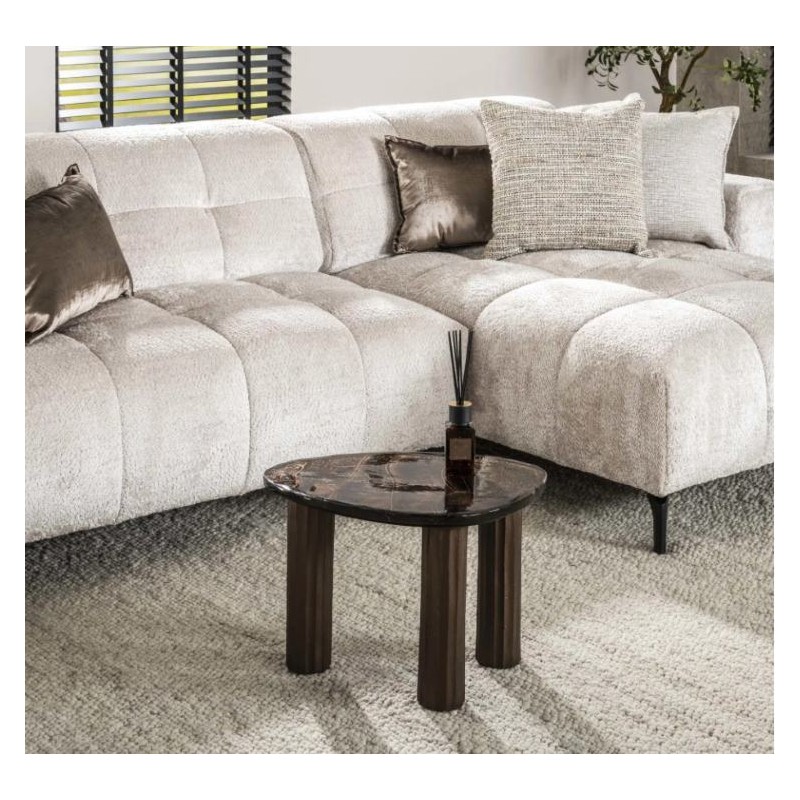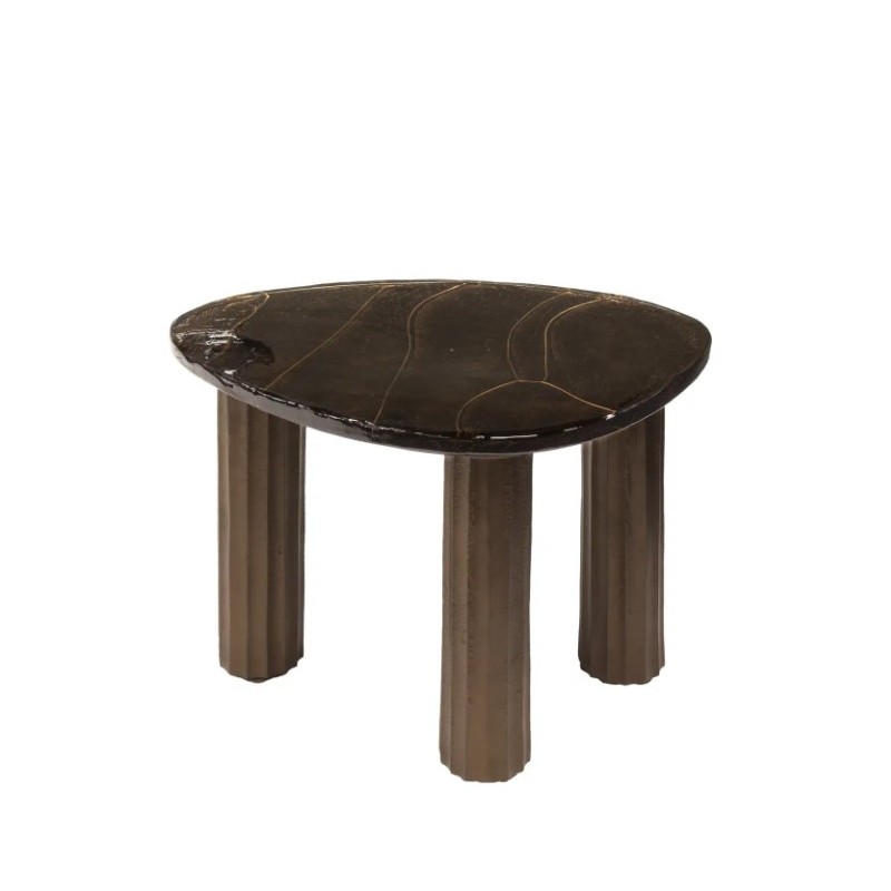 Stolik kawowy KIKO to idealne rozwiązanie dla miłośników elegancji i ciekawych form. Ten nietuzinkowy mebel dzięki swoim kształtom i nietypowej strukturze wprowadzi do pomieszczenia niesamowity styl przykuwając uwagę każdego. Blat osadzony został na metalowej odlewanej piaskowo potrójnej podstawie w odcieniu miedzianym dopasowanej idealnie do kolorystyki blatu. Głównym jego elementem jest ręcznie robiony blat o wyjątkowym połączeniu elegancji i nowoczesnego designu. Jego powierzchnia została pokryta specjalną, przezroczystą powłoką z żywicy epoksydowej, znaną jako efekt płynnego szkła. Dzięki temu blat zyskuje idealnie lśniące wykończenie, a jednocześnie charakteryzuje się lekko falistą powierzchnią z delikatnymi nierównościami, nadając mu niepowtarzalny charakter. Odcień antycznej miedzi podkreśla elegancję mebla i pięknie odbija światło, tworząc subtelne refleksy. Stolik ten odnajdzie się znakomicie w każdym nowoczesnym przestronnym salonie gdzie bez wątpienia stanie się nie tylko funkcjonalnym meblem, ale także przepiękną dekoracją dodającą wnętrzu niesamowitego wyglądu.