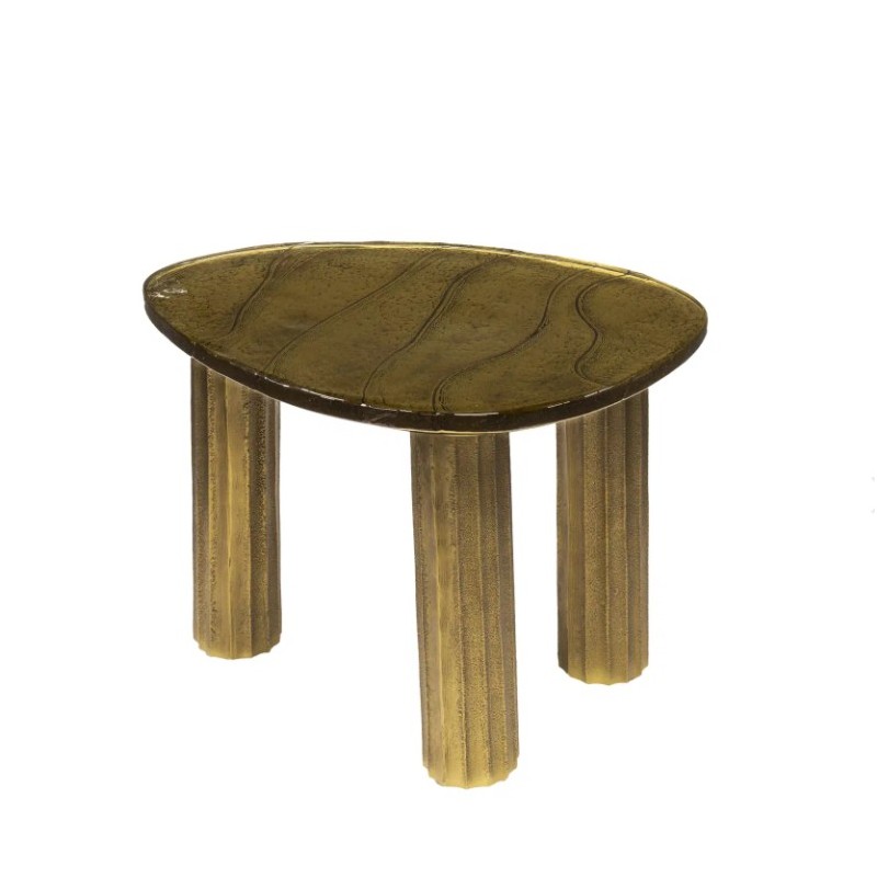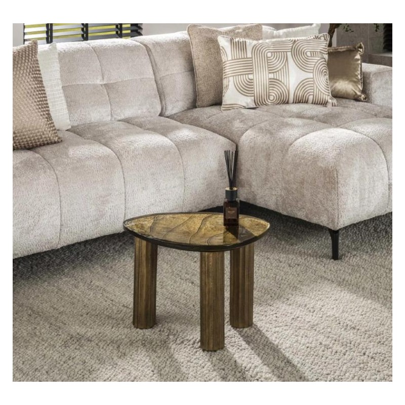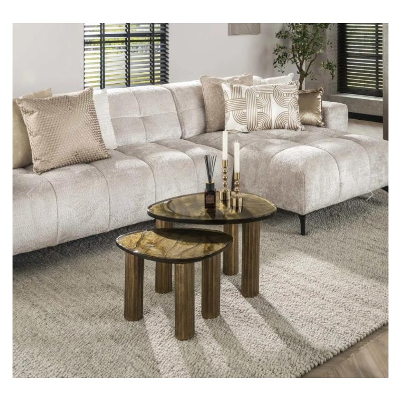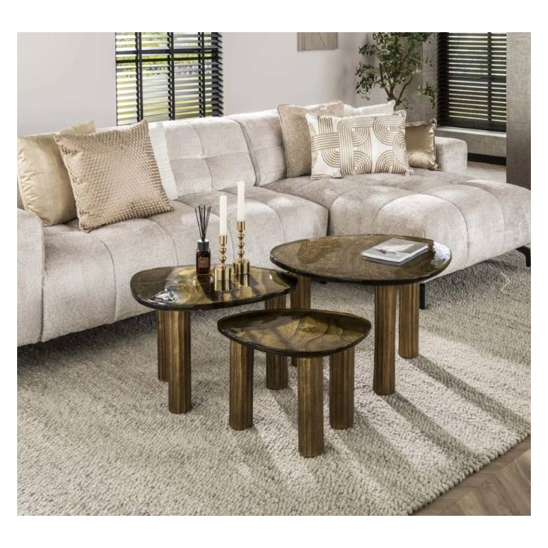 Stolik kawowy KIKO to idealne rozwiązanie dla miłośników elegancji i ciekawych form. Ten nietuzinkowy mebel dzięki swoim kształtom i nietypowej strukturze wprowadzi do pomieszczenia niesamowity styl przykuwając uwagę każdego. Blat osadzony został na metalowej odlewanej piaskowo potrójnej podstawie w odcieniu złota dopasowanej idealnie do kolorystyki blatu. Głównym jego elementem jest ręcznie robiony blat o wyjątkowym połączeniu elegancji i nowoczesnego designu. Jego powierzchnia została pokryta specjalną, przezroczystą powłoką z żywicy epoksydowej, znaną jako efekt płynnego szkła. Dzięki temu blat zyskuje idealnie lśniące wykończenie, a jednocześnie charakteryzuje się lekko falistą powierzchnią z delikatnymi nierównościami, nadając mu niepowtarzalny charakter. Odcień antycznego złota podkreśla elegancję mebla i pięknie odbija światło, tworząc subtelne refleksy. Stolik ten odnajdzie się znakomicie w każdym nowoczesnym przestronnym salonie gdzie bez wątpienia stanie się nie tylko funkcjonalnym meblem, ale także przepiękną dekoracją dodającą wnętrzu niesamowitego wyglądu.