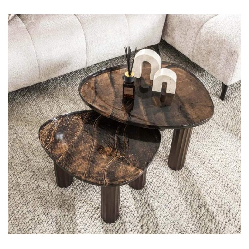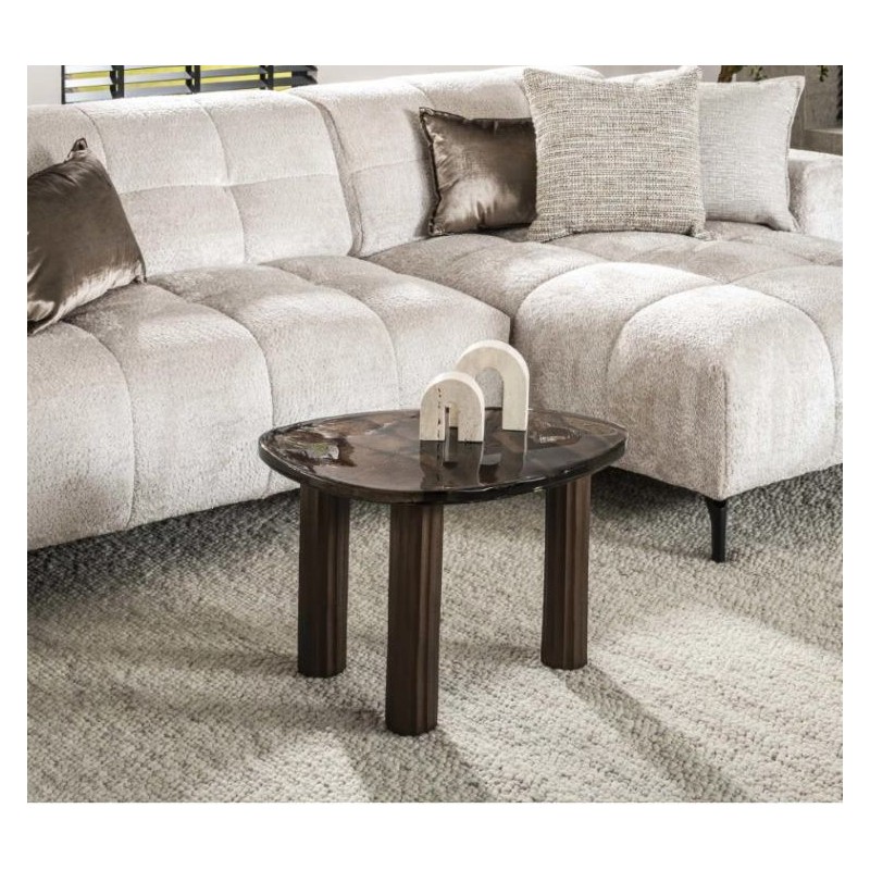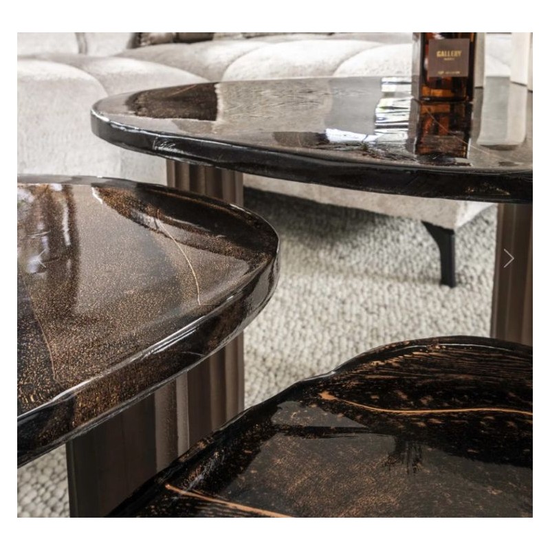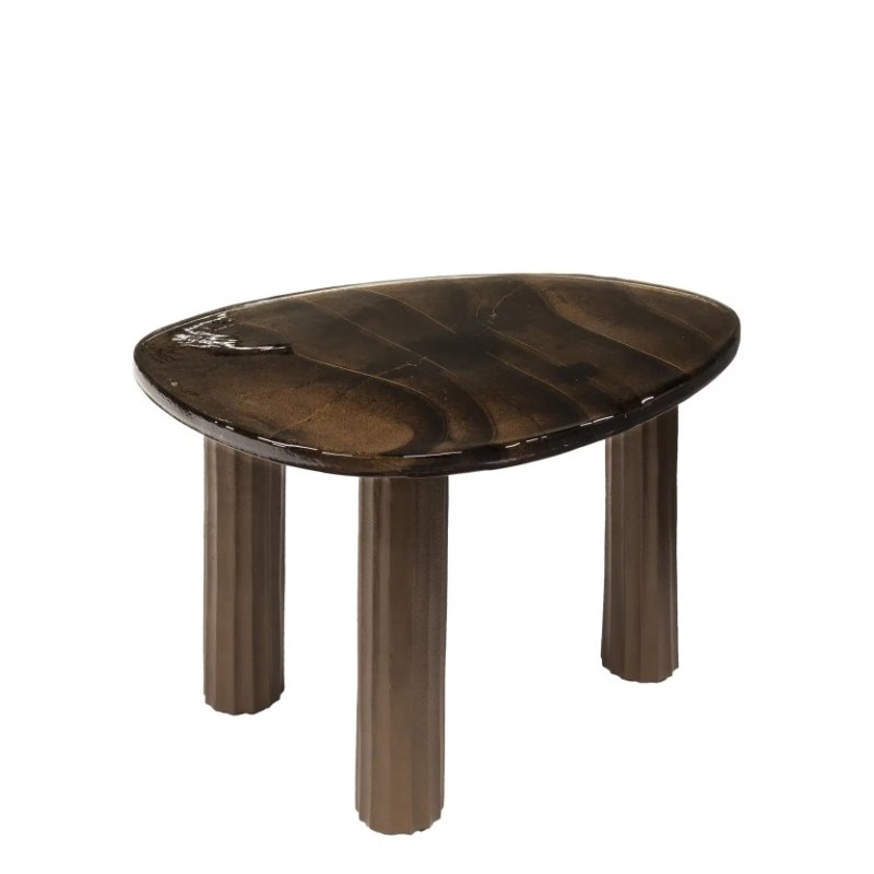 Stolik kawowy KIKO to idealne rozwiązanie dla miłośników elegancji i ciekawych form. Ten nietuzinkowy mebel dzięki swoim kształtom i nietypowej strukturze wprowadzi do pomieszczenia niesamowity styl przykuwając uwagę każdego. Blat osadzony został na metalowej odlewanej piaskowo potrójnej podstawie w odcieniu miedzianym dopasowanej idealnie do kolorystyki blatu. Głównym jego elementem jest ręcznie robiony blat o wyjątkowym połączeniu elegancji i nowoczesnego designu. Jego powierzchnia została pokryta specjalną, przezroczystą powłoką z żywicy epoksydowej, znaną jako efekt płynnego szkła. Dzięki temu blat zyskuje idealnie lśniące wykończenie, a jednocześnie charakteryzuje się lekko falistą powierzchnią z delikatnymi nierównościami, nadając mu niepowtarzalny charakter. Odcień antycznej miedzi podkreśla elegancję mebla i pięknie odbija światło, tworząc subtelne refleksy. Stolik ten odnajdzie się znakomicie w każdym nowoczesnym przestronnym salonie gdzie bez wątpienia stanie się nie tylko funkcjonalnym meblem, ale także przepiękną dekoracją dodającą wnętrzu niesamowitego wyglądu.
