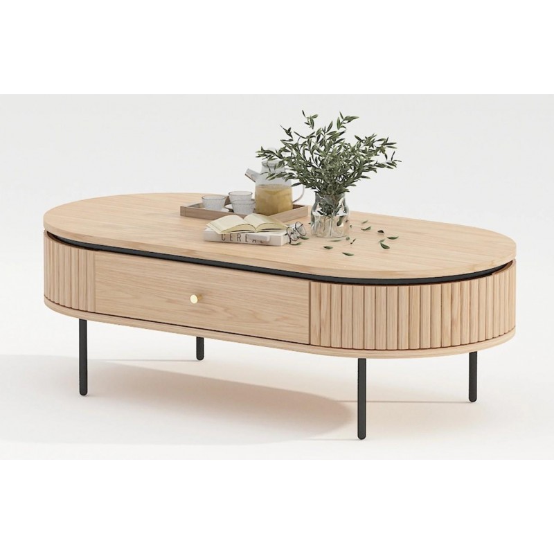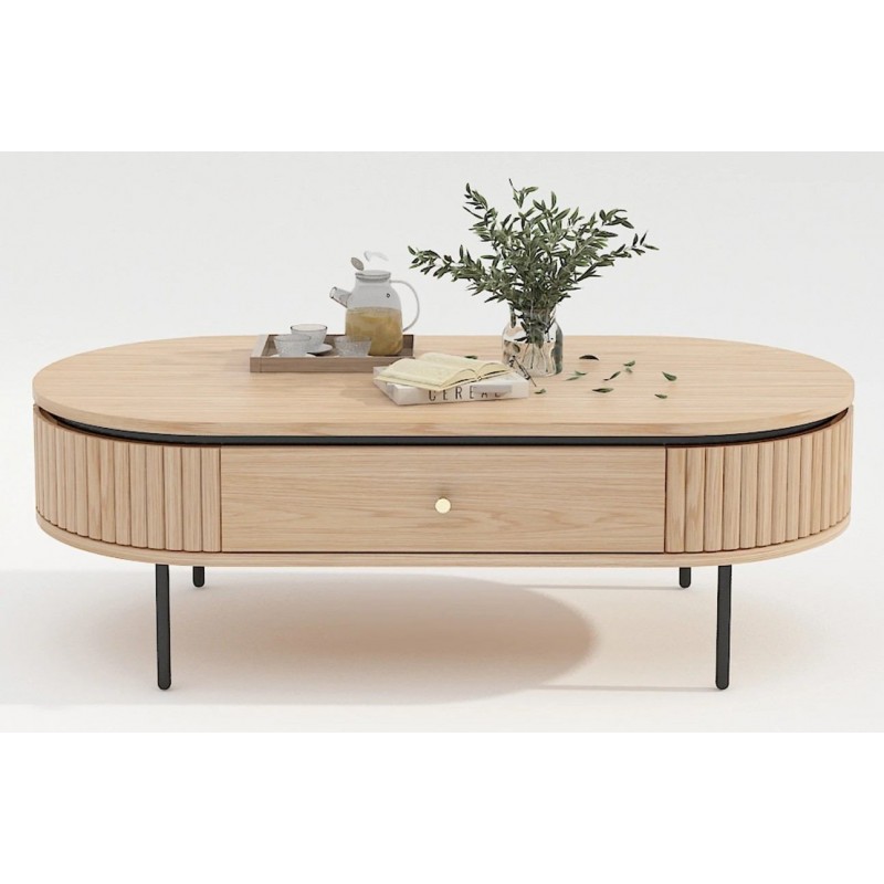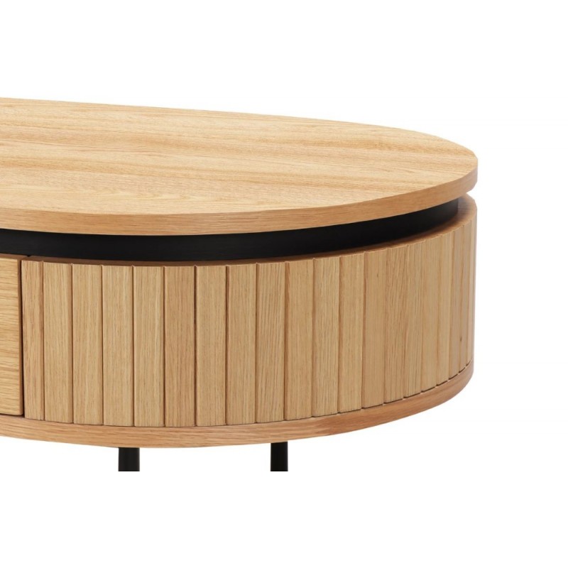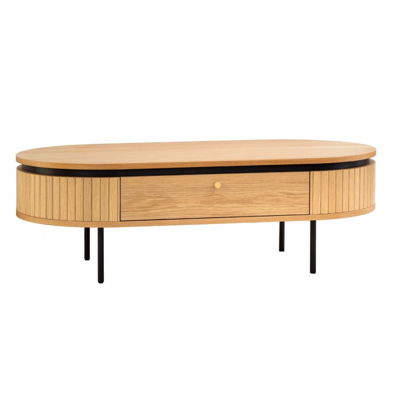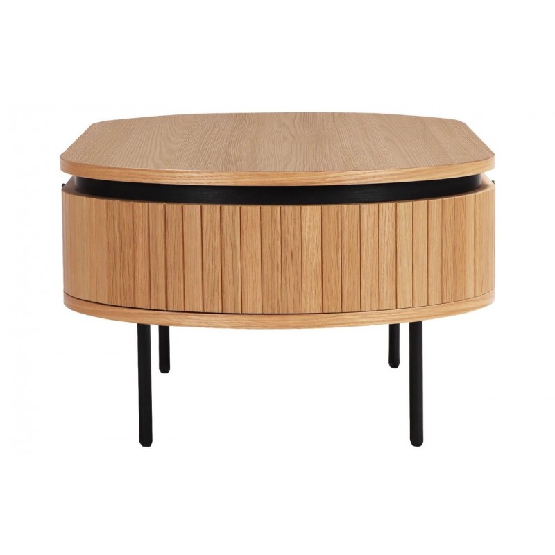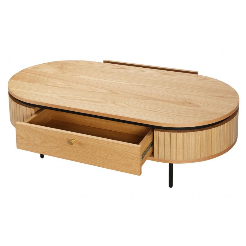 ATELIER to wyjątkowa propozycja dla tych, którzy cenią połączenie stylowego designu z nowoczesną elegancją. Stolik kawowy to idealne rozwiązanie do salonu, które doda naturalności oraz spokoju, a dzięki swojej wyjątkowej formie przykuje uwagę każdego. Wykonany został z płyty MDF oklejonej imitacją dębu oraz osadzony na stabilnej czarnej metalowej podstawie. Dzięki swojej smukłej linii całość wspaniale komponuje się z podstawą utrzymaną w ciemnej tonacji. Mebel ten jest bardzo pojemny, posiada dwie szuflady, które pomieszczą rzeczy codziennego użytku np: książki, dokumenty oferując tym samym dużą powierzchnię do przechowywania. Jego zaletą jest funkcjonalność, wytrzymałość oraz łatwość czyszczenia, wyróżnia się swoją wyrazistością, kolorem i strukturą powodując, że każdy egzemplarz jest unikatowy. Fronty lamelowe w imitacji dębu ze strukturą drewna nadają mu cennego i naturalnego wyrazu. Ponadto wykonany jest niewątpliwie z dużą precyzją, dzięki zachowaniu i odwzorcowaniu naturalnej oryginalności zarówno słojów jak i sęków. Bez wątpienia stolik ten sprawdzi się znakomicie w każdym nowoczesnym salonie, gdzie stanie się nie tylko funkcjonalnym meblem, ale także przepiękną dekoracją, dzięki której pomieszczenie nabierze naturalnego ciepła oraz niesamowitego stylu.