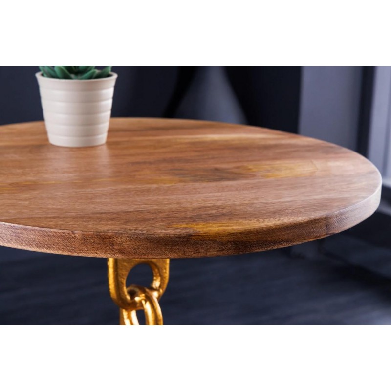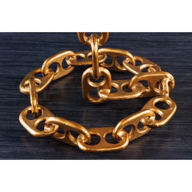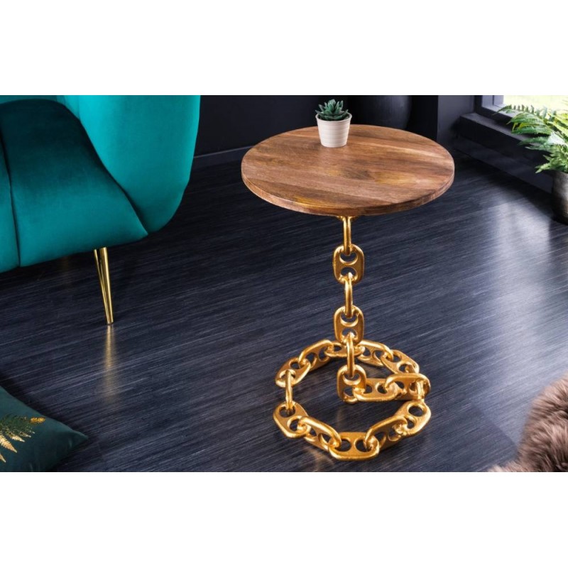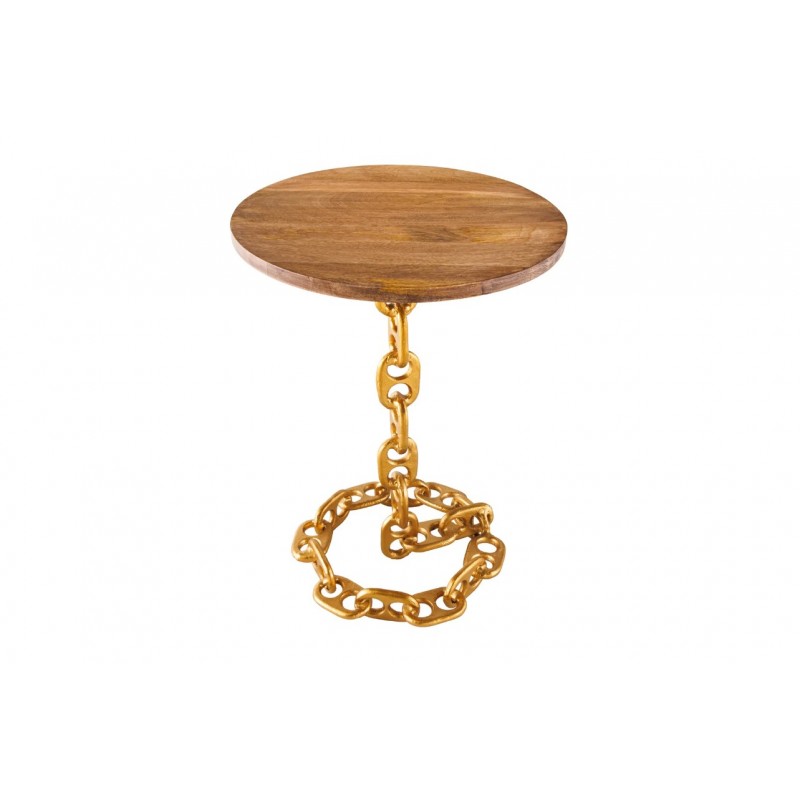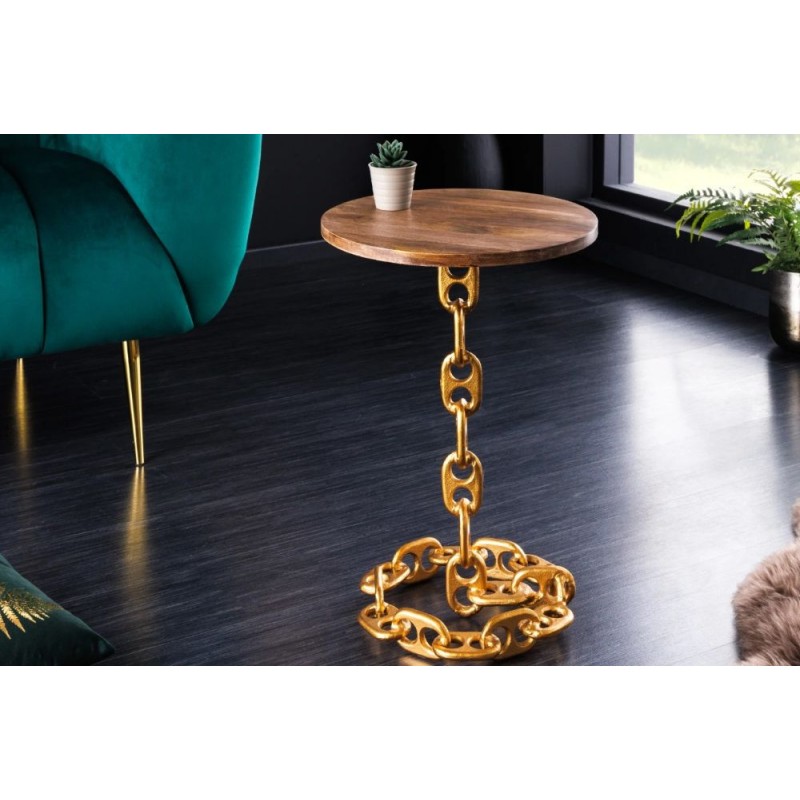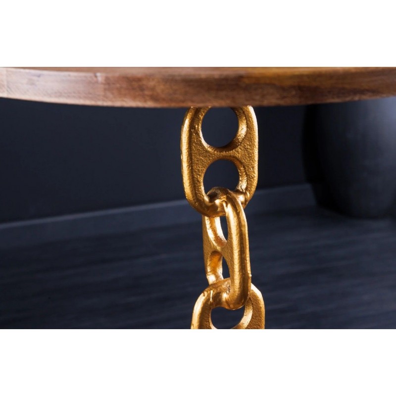 Stolik kawowy CHAIN to idealne rozwiązanie do każdego wnętrza w stylu nowoczesnym czy industrialnym, gdzie mebel ten stanie się oryginalną dekoracją dodającą przestrzeni charakteru i niesamowitego wykończenia. Podstawę stolika stanowi metalowa konstrukcja w kolorze złotym wyglądem przypominająca stary łańcuch. Na robiącej ogromne wrażenie złotej podstawie umieszczono ręcznie wykonany blat z drewna mango, którego unikalna struktura, sęki i widoczne słoje tworzą niepowtarzalny wygląd. Efekt końcowy połączenia drewna oraz złotej metalowej podstawy jest fenomenalny dzięki czemu idealnie sprawdzi się zarówno w salonach w stylu glamour jak i nowoczesnym, gdzie stanie się nie tylko funkcjonalnym dodatkiem, ale także przepiękną dekoracją nadającą niesamowitego wyglądu oraz charakteru.