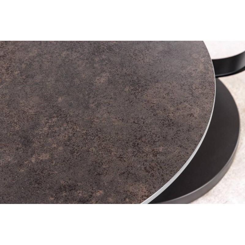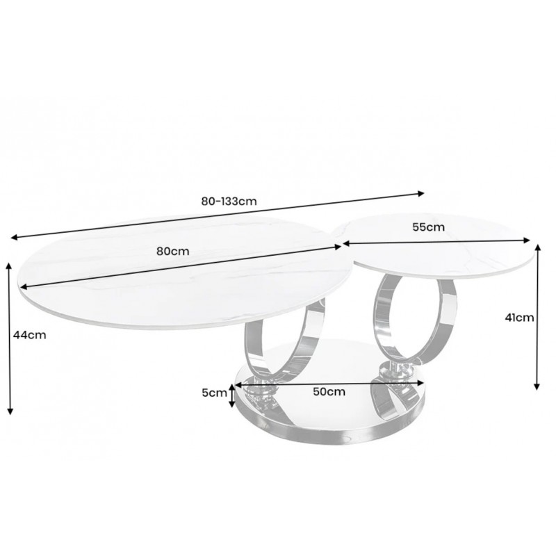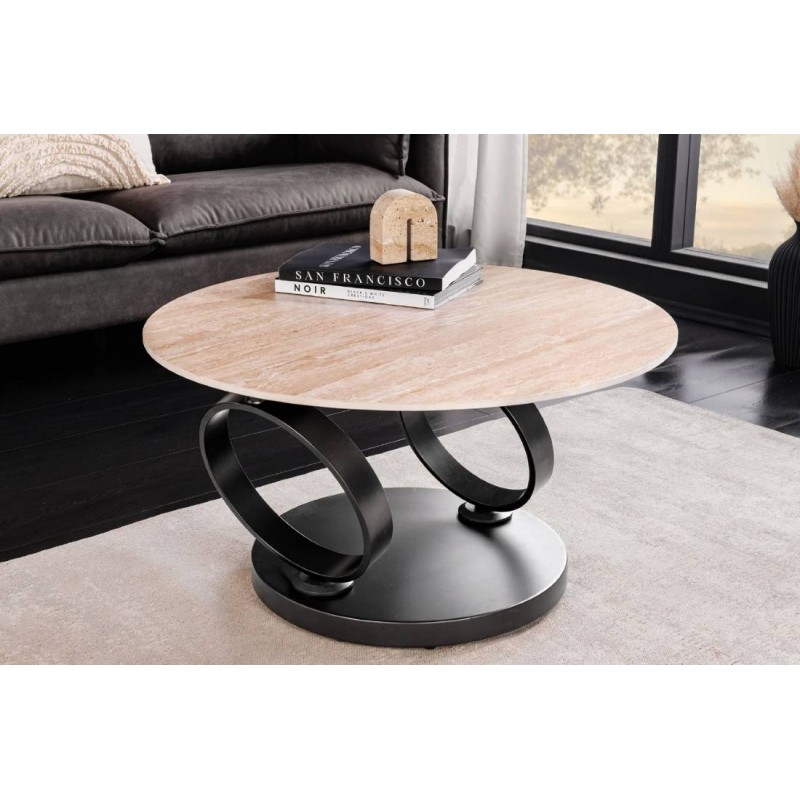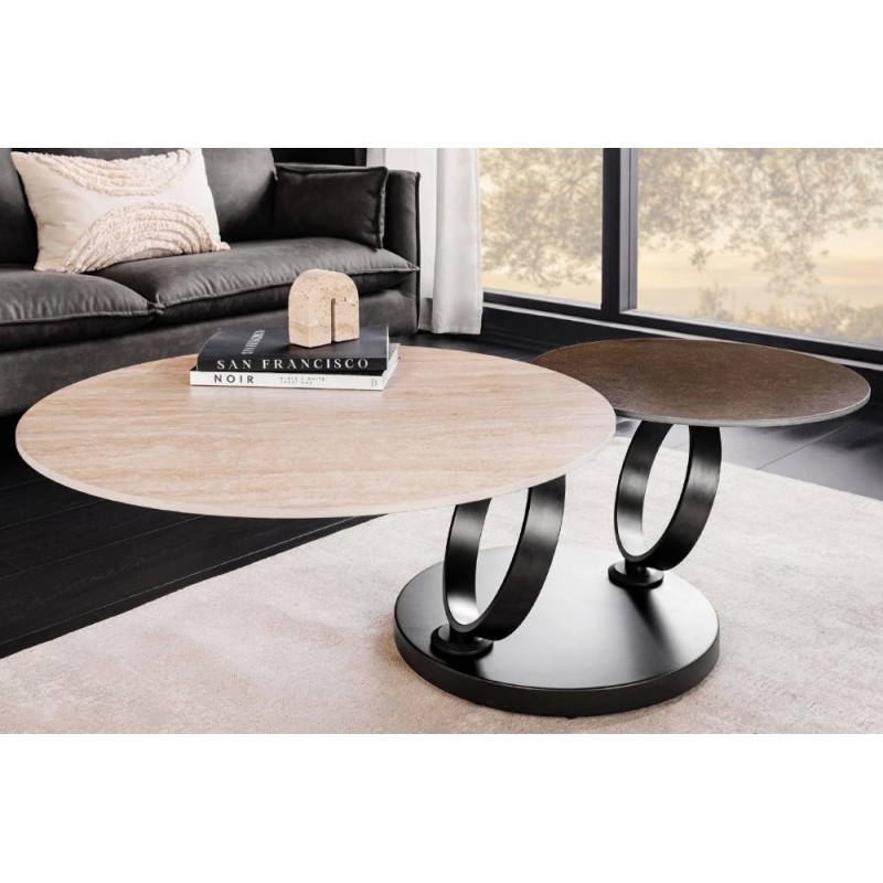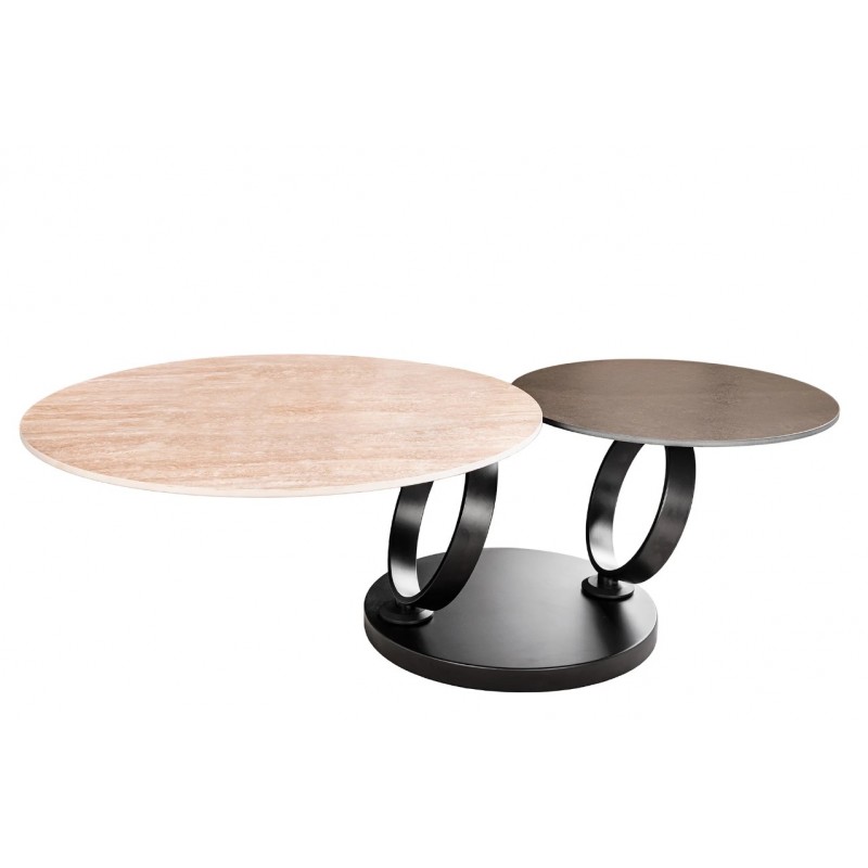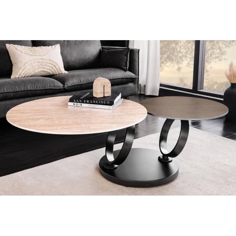 Stolik kawowy DANCING RINGS to znakomity mebel, który będzie idealny dla miłośników nietypowych rozwiązań i ciekawych form, dlatego bez wątpienia stolik ten sprawdzi się fenomenalnie w każdym wnętrzu urządzonym w stylu nowoczesnym. Obrotowa metalowa konstrukcja stolika w kolorze czarnym dodaje meblowi elegancji i szyku. Zastosowanie dwóch kolorowych blatów o różnych rozmiarach wykonanych z ceramiki, sprawiają, że stolik zyskuje dwa poziomy oraz funkcjonalny mechanizm obrotowy. Jego wyrazisty charakter podkreślają dekoracje z imitacji brązowego marmuru z rdzawymi akcentami oraz wykończenie inspirowane naturalnym trawertynem, uzupełnione elegancką, beżową tonacją i delikatnymi, jaśniejszymi odcieniami. Niewątpliwie największym atutem mebla jest możliwość obracania blatów według własnego uznania, co zapewnia i pozwala na zaoszczędzenie miejsca oraz przestrzeni. Doskonale łączy współczesny design z nowoczesnym stylem, a jego nietuzinkowy kształt bez wątpienia nada charakteru wnętrzu stając się atrakcyjnym i bardzo uniwersalnym dodatkiem dekoracyjnym nowoczesnego eleganckiego i wyrafinowanego salonu.