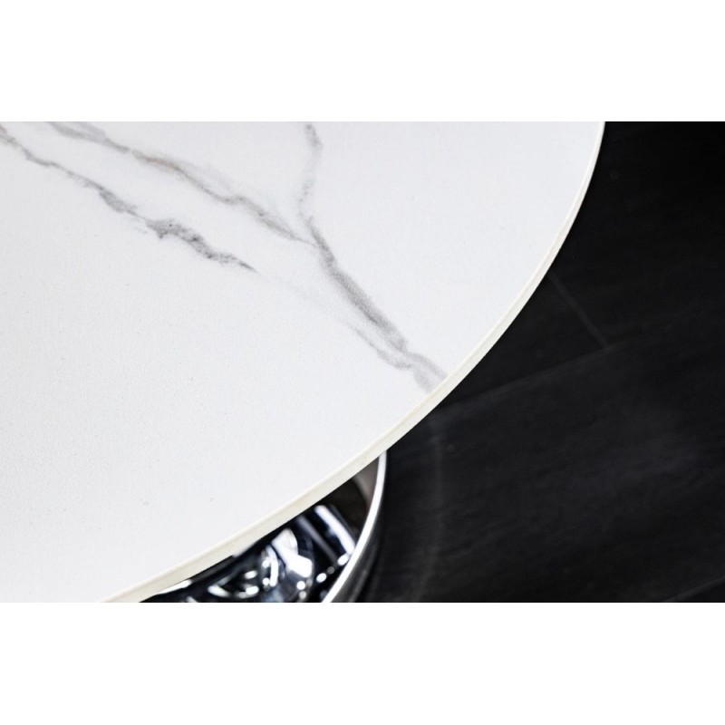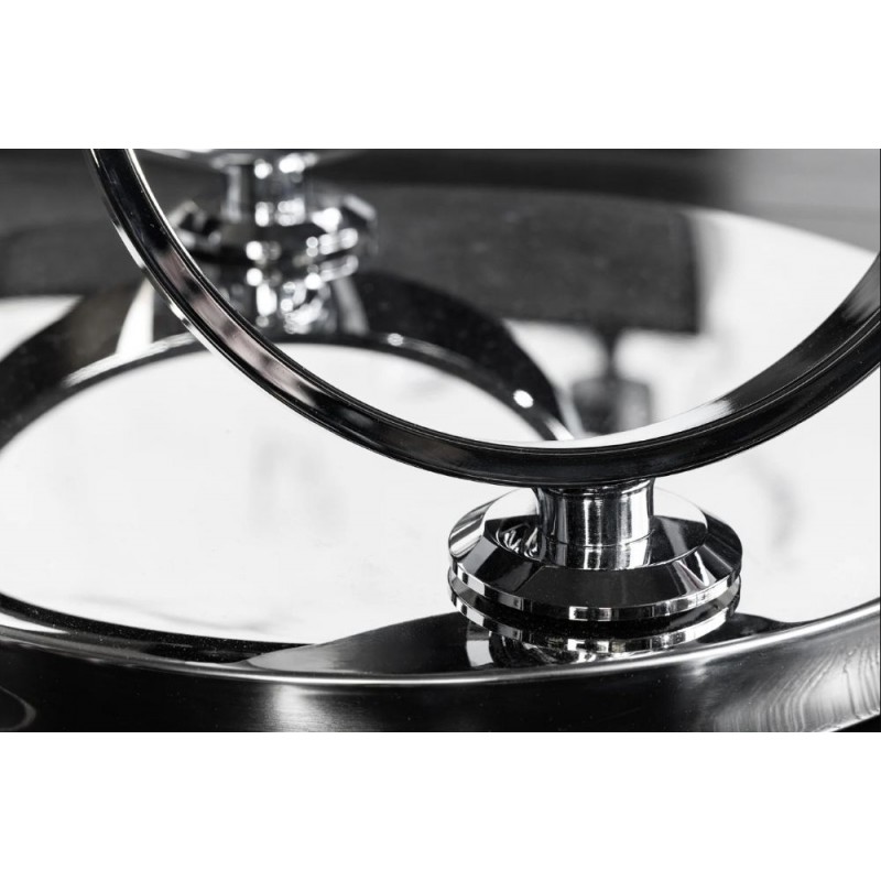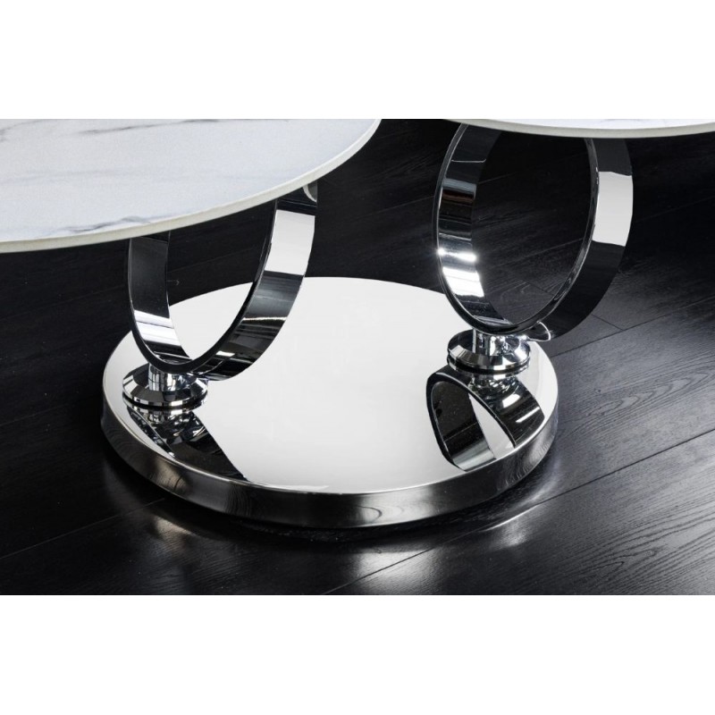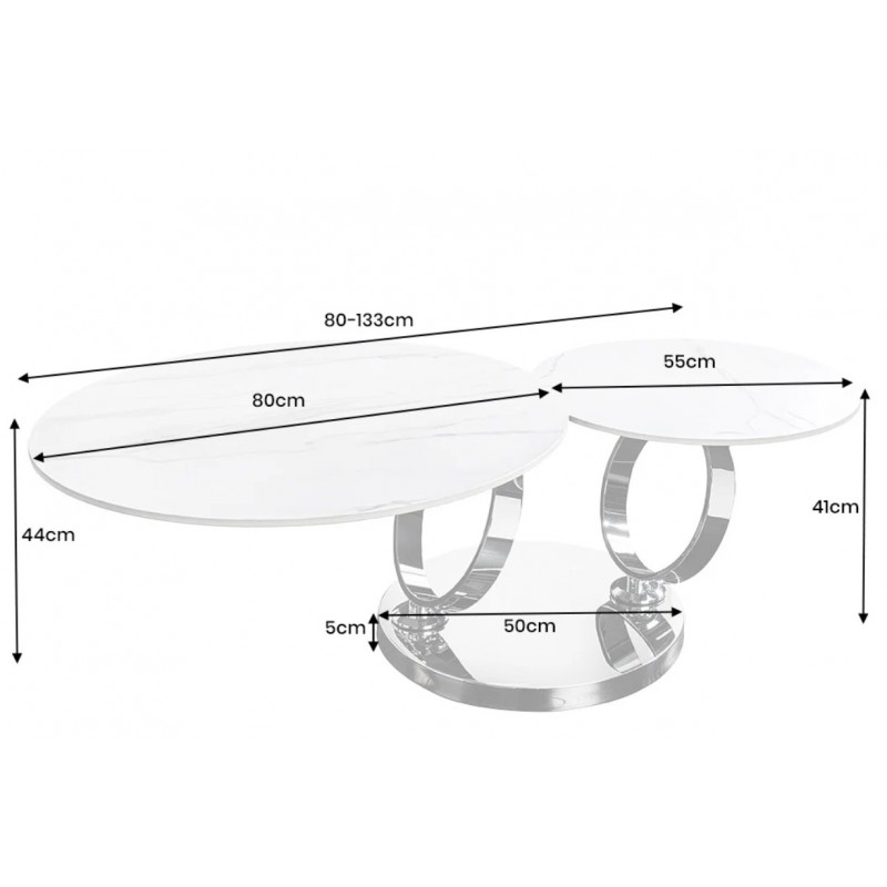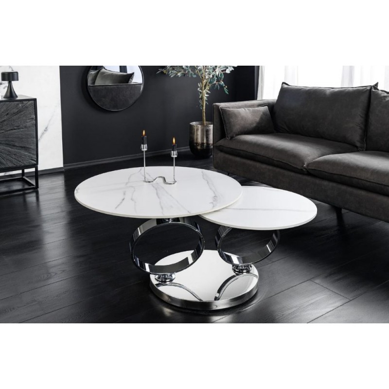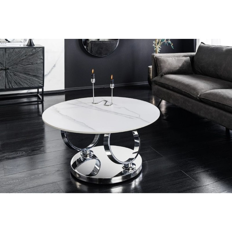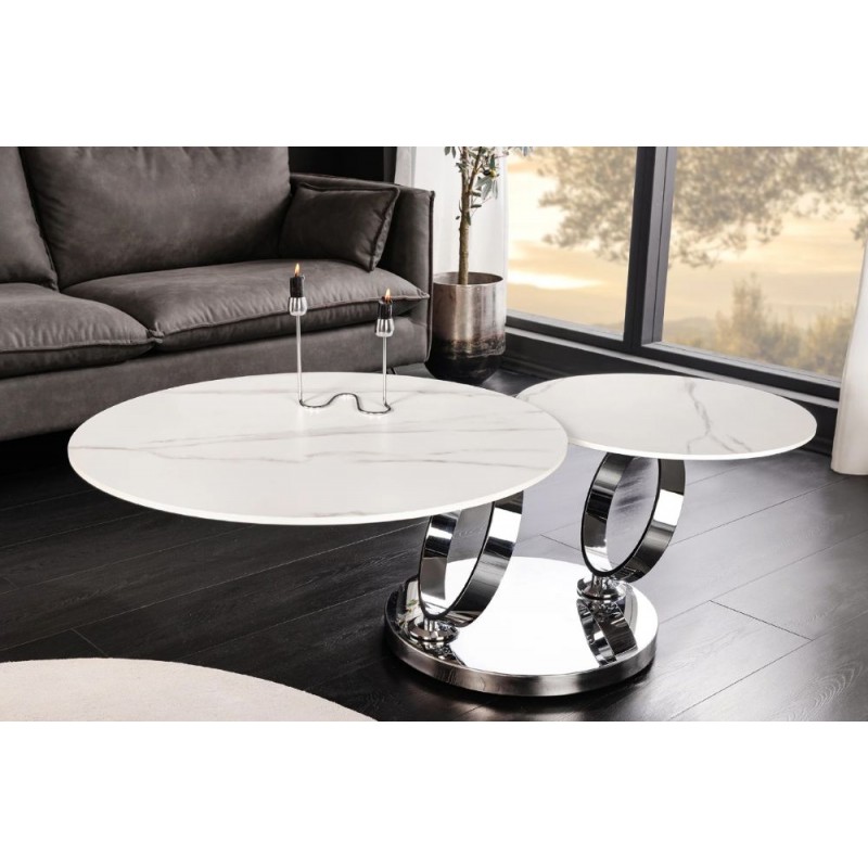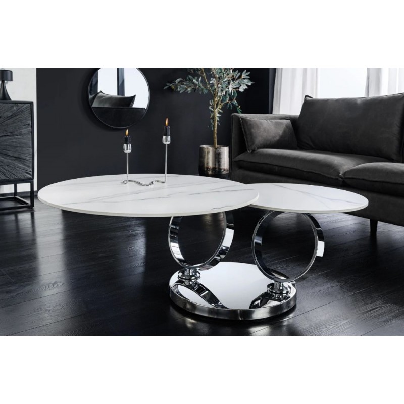 Stolik kawowy DANCING RINGS to znakomity mebel, który będzie idealny dla miłośników nietypowych rozwiązań i ciekawych form, dlatego bez wątpienia stolik ten sprawdzi się fenomenalnie w każdym wnętrzu urządzonym w stylu nowoczesnym. Obrotowa chromowana konstrukcja stolika w kolorze srebrnym dodaje meblowi elegancji i stylu. Zastosowanie dwóch blatów o różnych rozmiarach wykonanych z ceramiki, sprawiają, że stolik zyskuje dwa poziomy oraz funkcjonalny mechanizm obrotowy. Wyróżnia się on między innymi swoją wyrazistością poprzez zastosowanie w nim dekoracji w formie imitacji białego marmuru, którego elegancką kolorystykę dopełniają charakterystyczne barwienia oraz nitki w szarych kolorach. Niewątpliwie największym atutem mebla jest możliwość obracania blatów według własnego uznania, co zapewnia i pozwala na zaoszczędzenie miejsca oraz przestrzeni. Doskonale łączy współczesny design z nowoczesnym stylem, a jego nietuzinkowy kształt bez wątpienia nada charakteru wnętrzu stając się atrakcyjnym i bardzo uniwersalnym dodatkiem dekoracyjnym nowoczesnego eleganckiego i wyrafinowanego salonu.