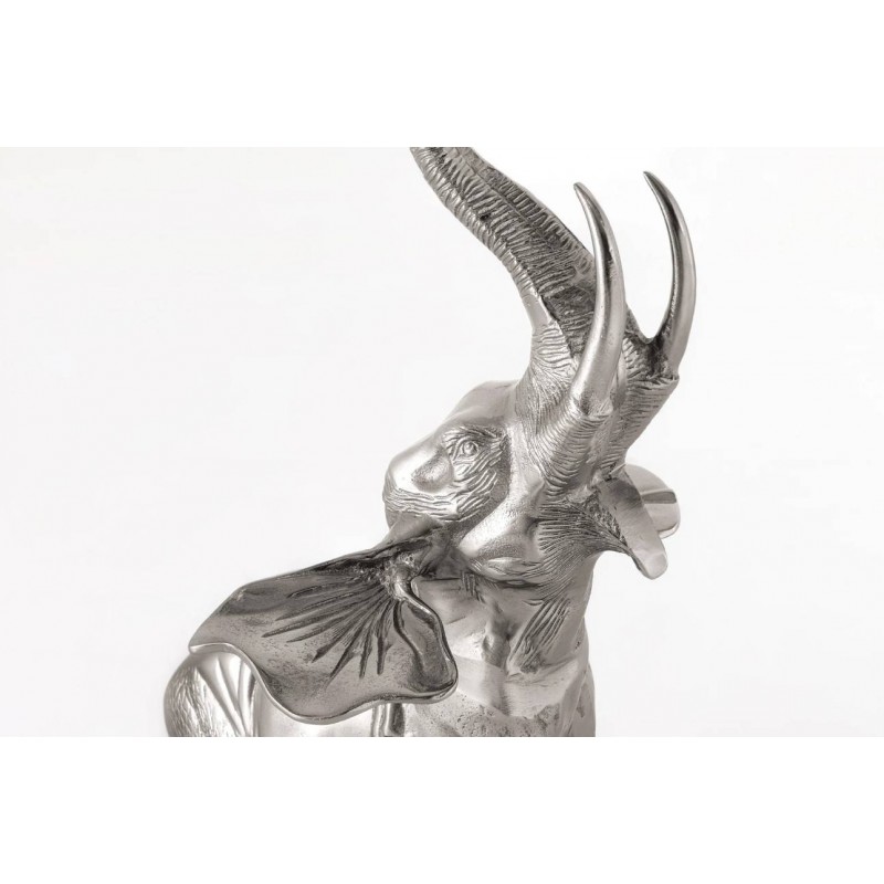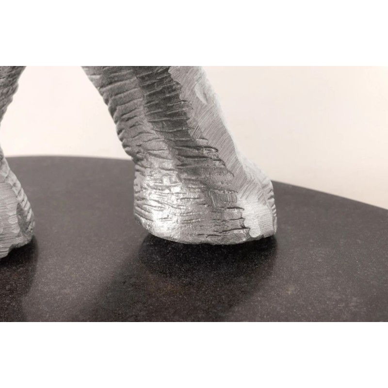 Stolik kawowy ELEPHANT to wyjątkowy mebel, który stanie się prawdziwą ozdobą każdego nowoczesnego wnętrza. Jego niezwykła forma przyciąga wzrok i nadaje aranżacji niepowtarzalnego charakteru. Największe wrażenie robi osadzona na ciemnym marmurze zjawiskowa ręcznie robiona podstawa stolika wykonana z aluminium w odcieniu srebrnym, której dekoracyjna forma, wzbogacona o motyw słonia, dodający całości lekkości i niepowtarzalnego uroku. To właśnie ten detal czyni mebel absolutnie unikalnym i artystycznym elementem wystroju. Na efektownej podstawie osadzony został okrągły blat z hartowanego szkła, który nie tylko zachwyca elegancją, ale również pozwala w pełni podziwiać oryginalną konstrukcję stolika. Połączenie metalu i szkła tworzy spójną, luksusową całość, która świetnie komponuje się z wyrafinowanymi aranżacjami. Bez wątpienia sprawdzi się idealnie w salonach urządzonych w stylu glamour jak i nowoczesnym, gdzie stanie się nie tylko funkcjonalnym dodatkiem, ale także przepiękną dekoracją nadającą niesamowitego wyglądu oraz charakteru.