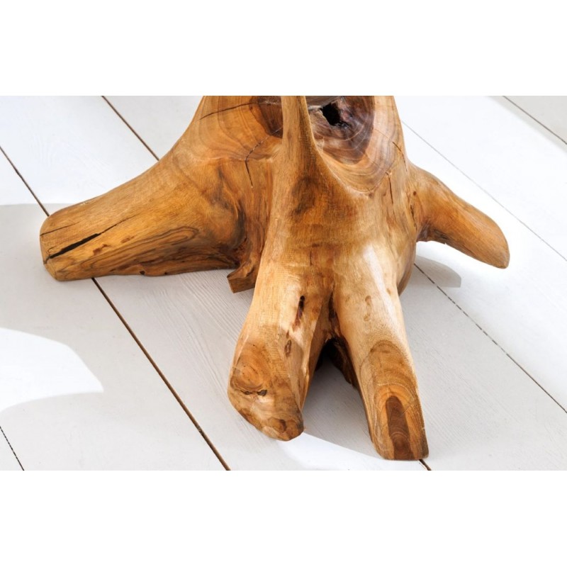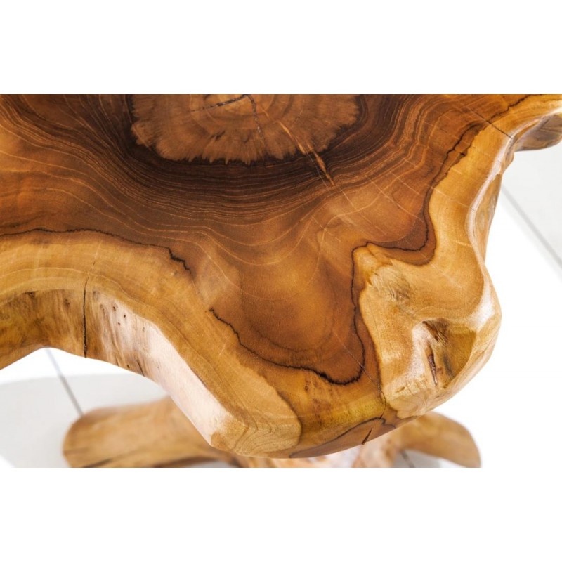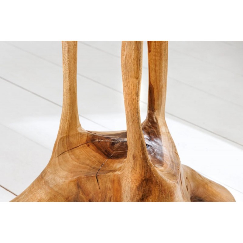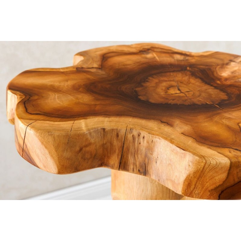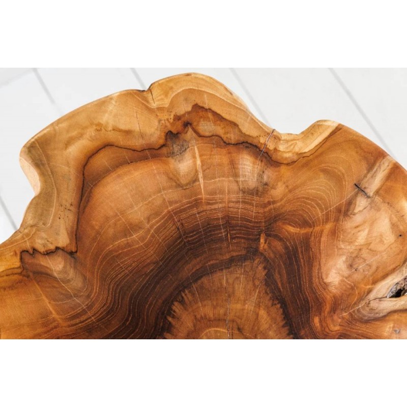 Stolik ROOT to idealne rozwiązanie do każdego wnętrza w stylu industrialnym czy rustykalnym, gdzie mebel ten dzięki swojej niesamowitej formie przykuje uwagę każdego, a także doda wnętrzu naturalnego wykończenia. Robiący ogromne wrażenie blat został wykonany z drewna tekowego w jego naturalnym kolorze, całość mebla osadzono na lakierowanej solidnej konstrukcji. Wysokiej jakości drewno tekowe gwarantuje nie tylko estetyczny wygląd, ale także stabilność. Uwydatniona na niej została naturalna struktura drewna z widocznymi słojami i sękami, która podkreśla ręczne wykonanie i sprawia, że każdy egzemplarz jest niepowtarzalny. Połączenie naturalnego drewna wraz z jego podstawą jest spójna i jednolita sprawiając, że doskonale łączy estetykę z trwałością, tworząc przytulny i stylowy akcent. ROOT znakomicie odnajdzie się w każdym salonie oraz jadalni, stając się nie tylko funkcjonalnym meblem, ale także przepiękną dekoracją, która dzięki swojej kolorystyce ociepli przestrzeń, dodając niesamowitego charakteru.
