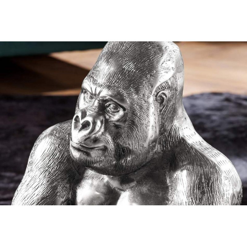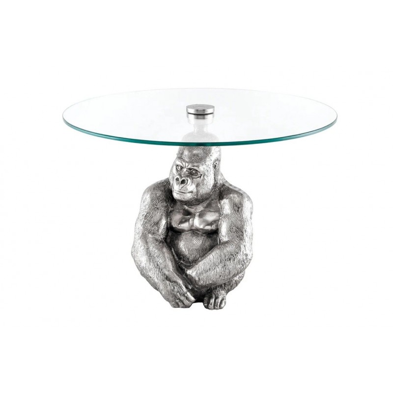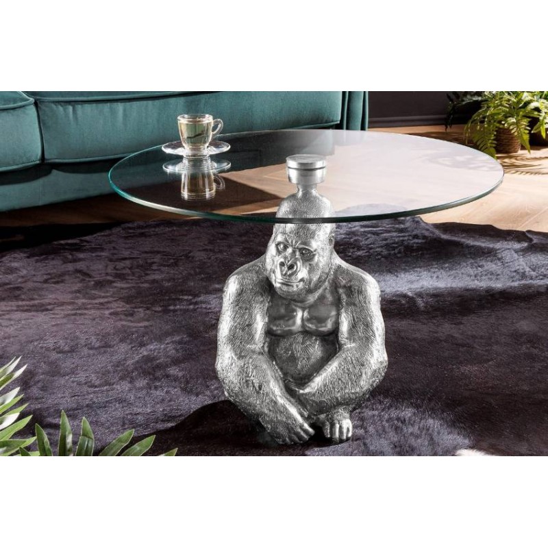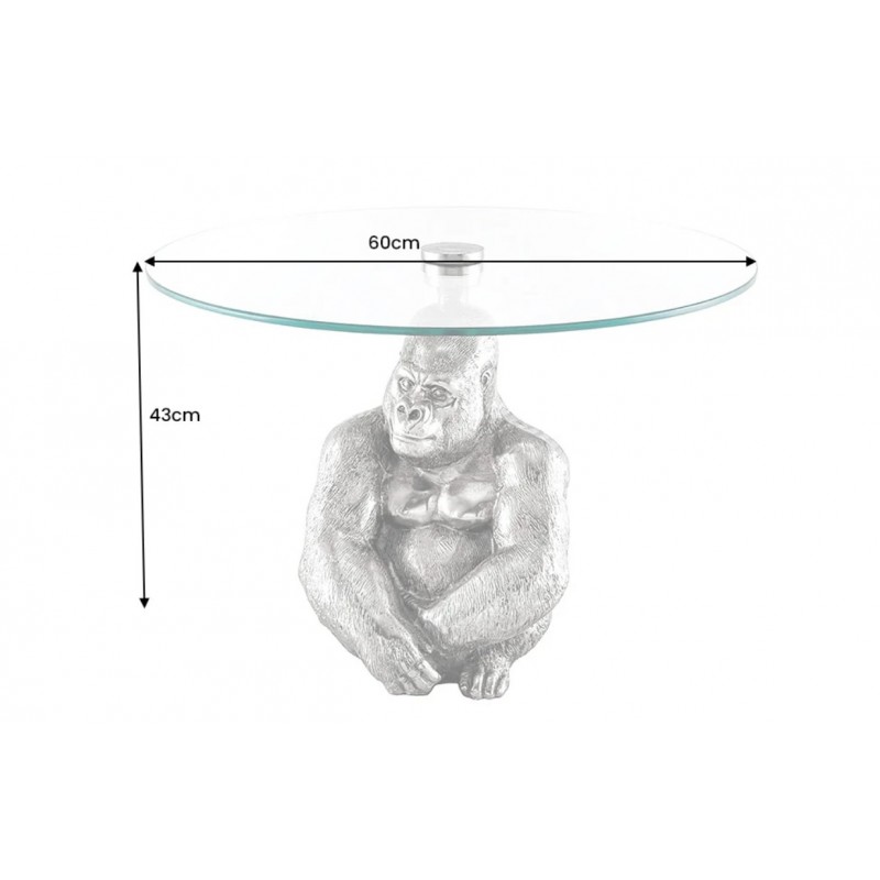 Stolik kawowy KONG to wyjątkowy mebel, który stanie się prawdziwą ozdobą każdego nowoczesnego wnętrza. Jego niezwykła forma przyciąga wzrok i nadaje aranżacji niepowtarzalnego charakteru. Największe wrażenie robi zjawiskowa podstawa stolika wykonana z aluminium w kolorze srebrnym, która swoim kształtem przypomina goryla. To właśnie ten detal czyni mebel absolutnie unikalnym i artystycznym elementem wystroju. Na efektownej podstawie osadzony został okrągły blat z hartowanego szkła, który nie tylko zachwyca elegancją, ale również pozwala w pełni podziwiać oryginalną konstrukcję stolika. Połączenie metalu i szkła tworzy spójną, luksusową całość, która świetnie komponuje się z wyrafinowanymi aranżacjami. Bez wątpienia sprawdzi się idealnie w salonach urządzonych w stylu nowoczesnym, gdzie stanie się nie tylko funkcjonalnym dodatkiem, ale także przepiękną dekoracją nadającą niesamowitego wyglądu oraz charakteru.