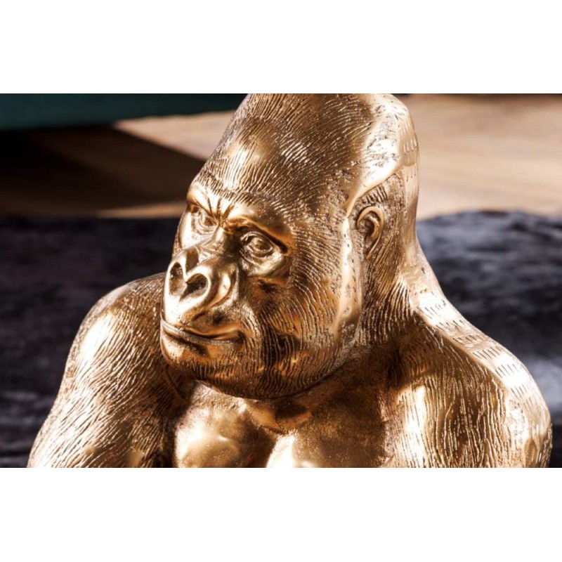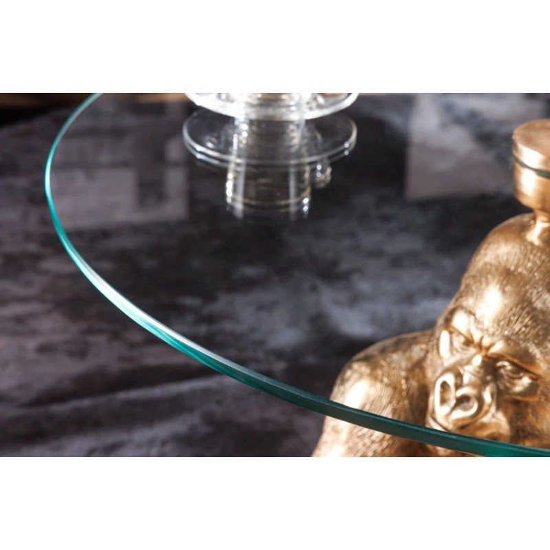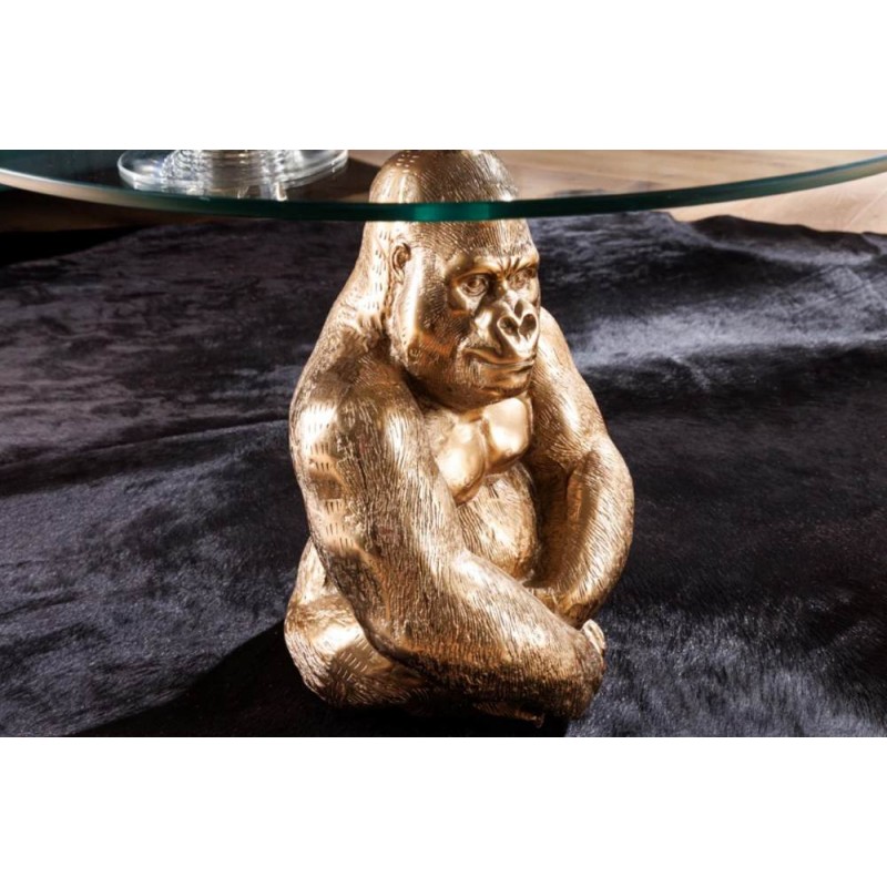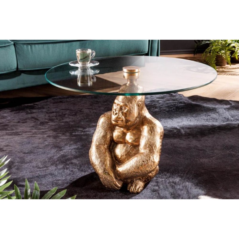 Stolik kawowy KONG to wyjątkowy mebel, który stanie się prawdziwą ozdobą każdego nowoczesnego wnętrza. Jego niezwykła forma przyciąga wzrok i nadaje aranżacji niepowtarzalnego charakteru. Największe wrażenie robi zjawiskowa podstawa stolika wykonana z aluminium w odcieniu złotym, która swoim kształtem przypomina goryla. To właśnie ten detal czyni mebel absolutnie unikalnym i artystycznym elementem wystroju. Na efektownej podstawie osadzony został okrągły blat z hartowanego szkła, który nie tylko zachwyca elegancją, ale również pozwala w pełni podziwiać oryginalną konstrukcję stolika. Połączenie metalu i szkła tworzy spójną, luksusową całość, która świetnie komponuje się z wyrafinowanymi aranżacjami. Bez wątpienia sprawdzi się idealnie w salonach urządzonych w stylu glamour jak i nowoczesnym, gdzie stanie się nie tylko funkcjonalnym dodatkiem, ale także przepiękną dekoracją nadającą niesamowitego wyglądu oraz charakteru.