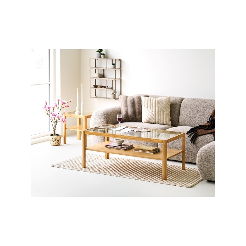 Stolik kawowy o wymiarach 110 × 60 × 45 cm to harmonijne połączenie forniru dębowego oraz hartowanego szkła. Konstrukcja utrzymana w naturalnej kolorystyce podkreśla ponadczasowy charakter mebla i wprowadza do wnętrza ciepło oraz lekkość. Drewniana podstawa zachwyca subtelnym usłojeniem i solidnym wykonaniem, a blat z hartowanego szkła dodaje całości nowoczesnej elegancji, optycznie powiększając przestrzeń. Dodatkowa półka pod blatem zwiększa funkcjonalność stolika, oferując praktyczne miejsce do przechowywania książek, czasopism lub dekoracji, bez zaburzania lekkiej formy mebla. Przemyślane proporcje sprawiają, że stolik doskonale sprawdzi się jako stylowy i praktyczny element salonu, łącząc naturalne materiały z nowoczesnym designem.