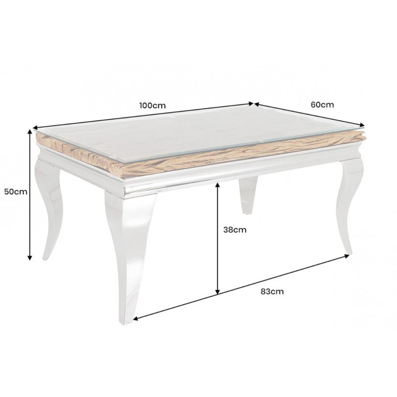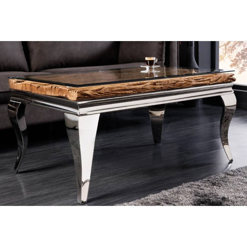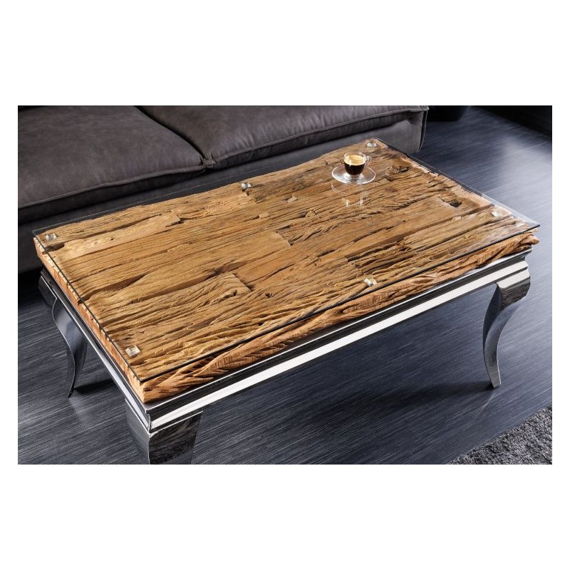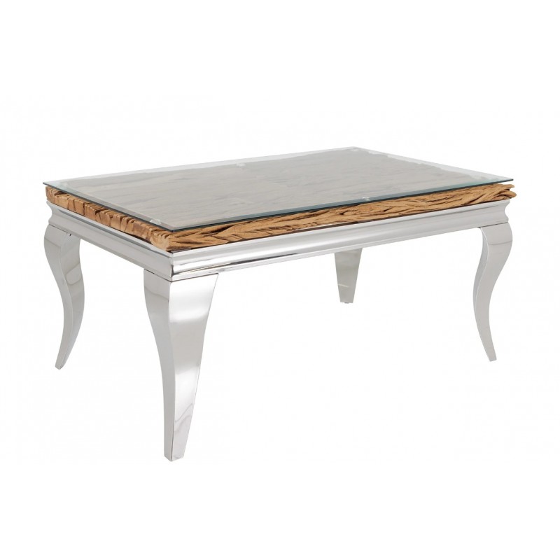 Stolik kawowy MODERN BAROCK BARRACUDA to idealne rozwiązanie do każdego salonu i wnętrza w stylu nowoczesnym, gdzie mebel ten dzięki swojej unikatowej formie przykuje uwagę każdego, a także nada wnętrzu charakteru i naturalnego wykończenia. W górnej części składa się z przezroczystego blatu wykonanego ze szkła hartowanego, którego bez wątpienia głównym atutem jest niesamowity blat znajdujący się pod szybą wykonany z częściowo postarzanego, litego drewna tekowego, pochodzącego z recyklingu. Dzięki zachowaniu oryginalnej struktury drewna w postaci szczelin, słojów i sęków prezentuje się zjawiskowo. Całość mebla została osadzona na stabilnej i solidnej metalowej konstrukcji wykonanej z polerowanej stali nierdzewnej w kolorze srebrnym. Mebel ten perfekcyjnie odzwierciedla styl nowoczesny oraz barokowy, a jego szlachetne wzornictwo sprawi, że twój salon uzyska trochę luksusu oraz niezwykłej i niepowtarzalnej charyzmy, charakteru oraz niezwykłej elegancji.