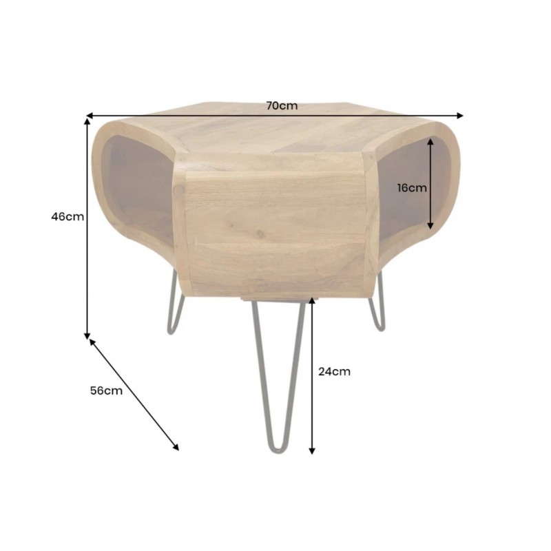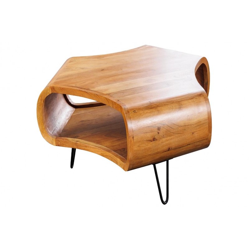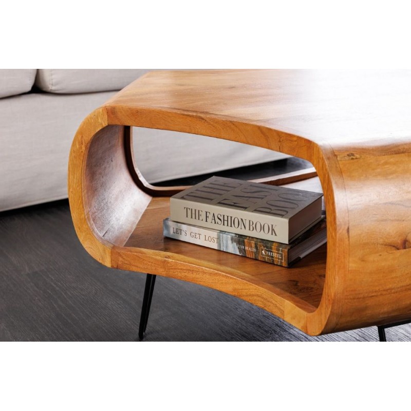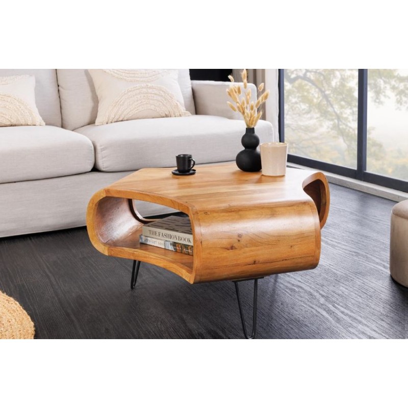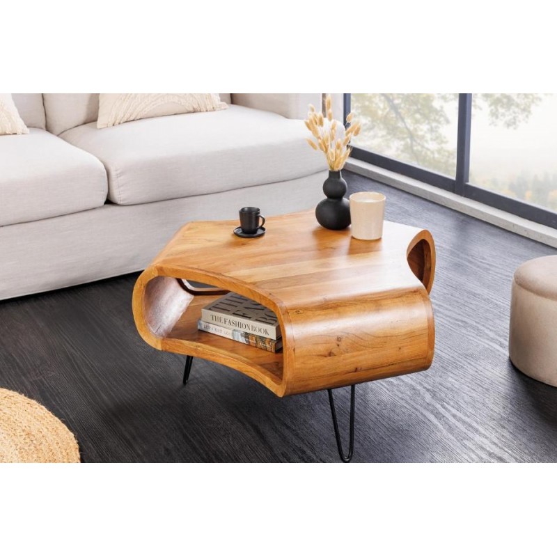 Stolik kawowy ORGANIC LIVING to idealne rozwiązanie do każdego nowoczesnego salonu, który doda naturalności oraz spokoju, a dzięki swojej wyjątkowej formie przykuje uwagę każdego. Postawiony został na stabilnej czarnej metalowej trójnożnej podstawie. Praktyczny oraz funkcjonalnym ręcznie robiony blat, wykonano z litego drewna akacji w kolorze miodowym, który dzięki zachowaniu oryginalności słojów, sęków oraz naturalnej krawędzi drzewa wygląda zjawiskowo. Efekt końcowy połączenia wykrojonego blatu wraz z otwartą półką oraz czarnej metalowej podstawy jest fenomenalny sprawiając tym samym, że idealnie wkomponuje się do każdego pomieszczenia, w którym delikatny kolor drewna doda mu ciepła oraz elegancji. Doskonale łączy współczesny design z naturalnym stylem, a jego geometryczny kształt nada charakteru wnętrzu stając się atrakcyjnym i bardzo uniwersalnym dodatkiem dekoracyjnym nowoczesnego eleganckiego i wyrafinowanego salonu.