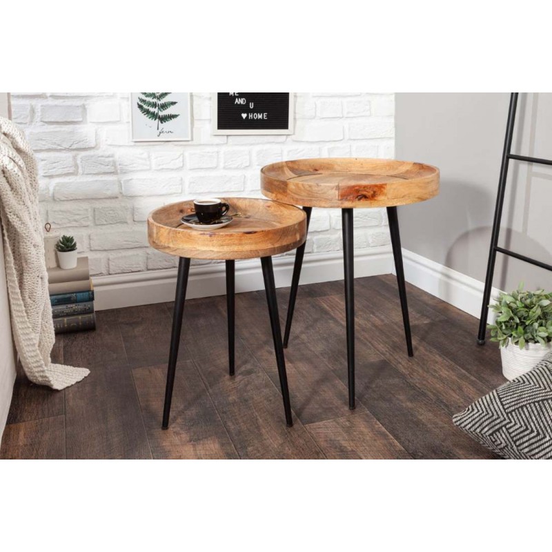 Stolik ten postawiony został na czarnych metalowych nogach, blat olejowany wykonany został z drewna mango. Charakterystyczną częścią tego blatu jest zaokrąglony blat oraz zachowanie oryginalności słojów, sęków, które w połączeniu z metalową konstrukcją, prezentuje się zjawiskowo. Mebel ten dzięki swoim niewielkim wymiarom zajmuje bardzo mało miejsca, przez co posiada wiele zastosowań. Idealnie on odzwierciedla styl nowoczesny, a dzięki jego praktycznemu zastosowaniu nada twojemu salonowi wygląd współczesny w stylu industrialnym.
