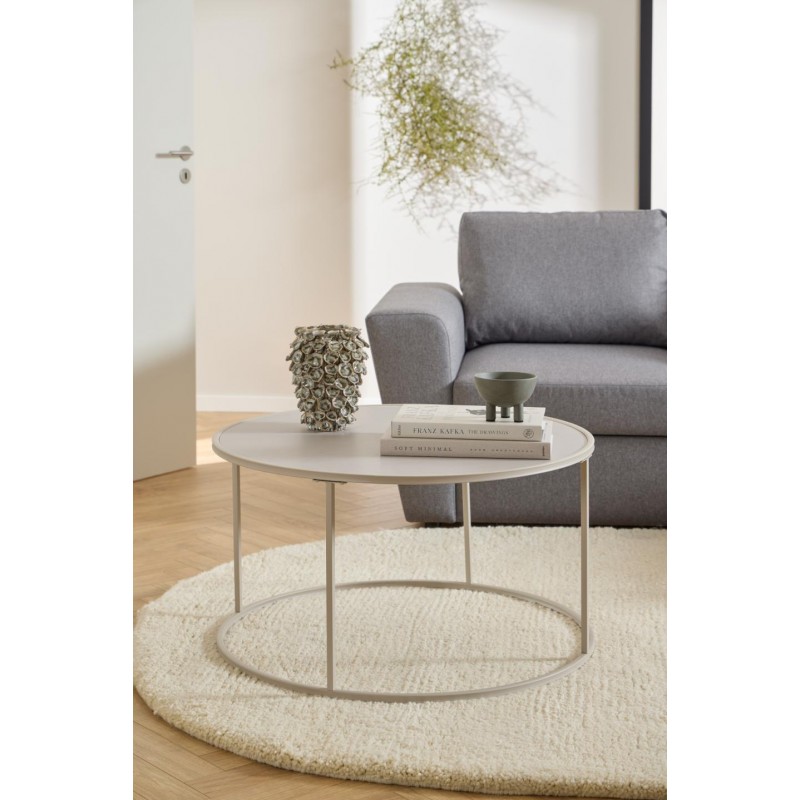 Okrągły stolik o niewielkich wymiarach sprawdzi się w wielu nowoczesnych wnętrzach. Wykonany w minimalistycznym stylu z metalowej, szarej podstawy i szarego blatu będzie stanowił elegancki dodatek w salonie.