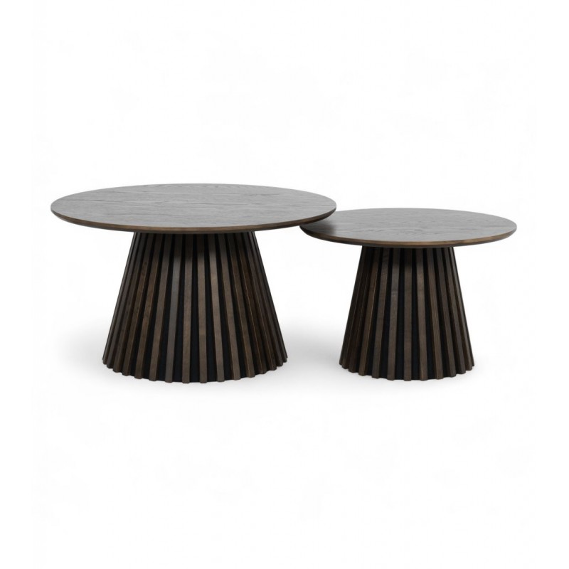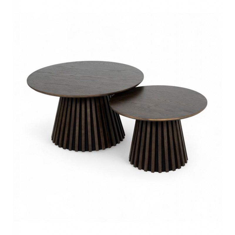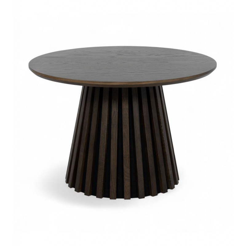 Stolik kawowy SVENDBORG to idealne rozwiązanie do każdego wnętrza w stylu skandynawskim, gdzie mebel ten dzięki swojej strukturze doda przestrzeni charakteru i naturalnego wykończenia. Lakierowana powierzchnia mebla, nadaje ciepła i wyrafinowania każdemu wnętrzu harmonijnie komponując się z różnymi stylami aranżacji. Duży praktyczny blat wykonano z płyty MDF z dekorem drewnianym oklejonym imitacją przydymionego dębu w kolorze brązowym, który osadzono na solidnej okrągłej podstawie w formie listew przypominających podłużne pionowe lamele. Bez wątpienia wyróżnia się swoją wyrazistością poprzez zachowanie na nim oryginalnych słoi, sęków oraz naturalności drewna co sprawia, że wygląda zjawiskowo, nadając każdemu wnętrzu oryginalnego charakteru elegancji i nowoczesności. Ogromną zaletą jest nie tyle funkcjonalność jak również duża wytrzymałość oraz łatwość czyszczenia, która wyróżniają się swoją naturalnością, kolorem oraz strukturą sprawiając przy tym, że każdy egzemplarz jest unikatowy. Efekt końcowy połączenia blatu oraz podstawy z płyty MDF jest jednolity, dzięki czemu całość mebla stanie się wspaniałą dekoracją, która doda wnętrzu nowoczesnego wykończenia oraz niesamowitego wyglądu. Jego zjawiskowa forma dopełni wnętrza w stylu nowoczesnym, boho, a nawet rustykalnym gdzie będzie zachwycał pięknym wykończeniem.