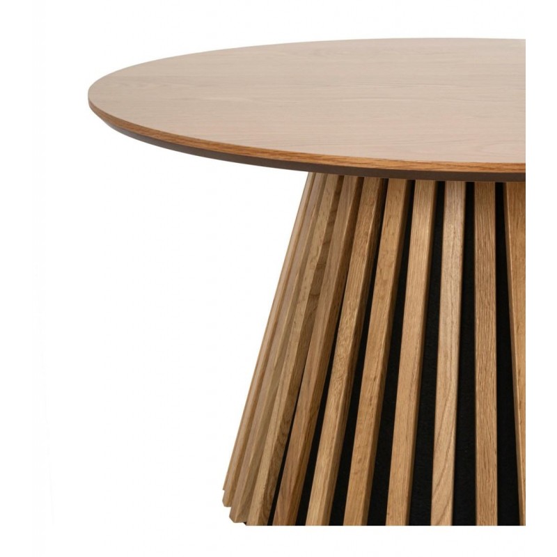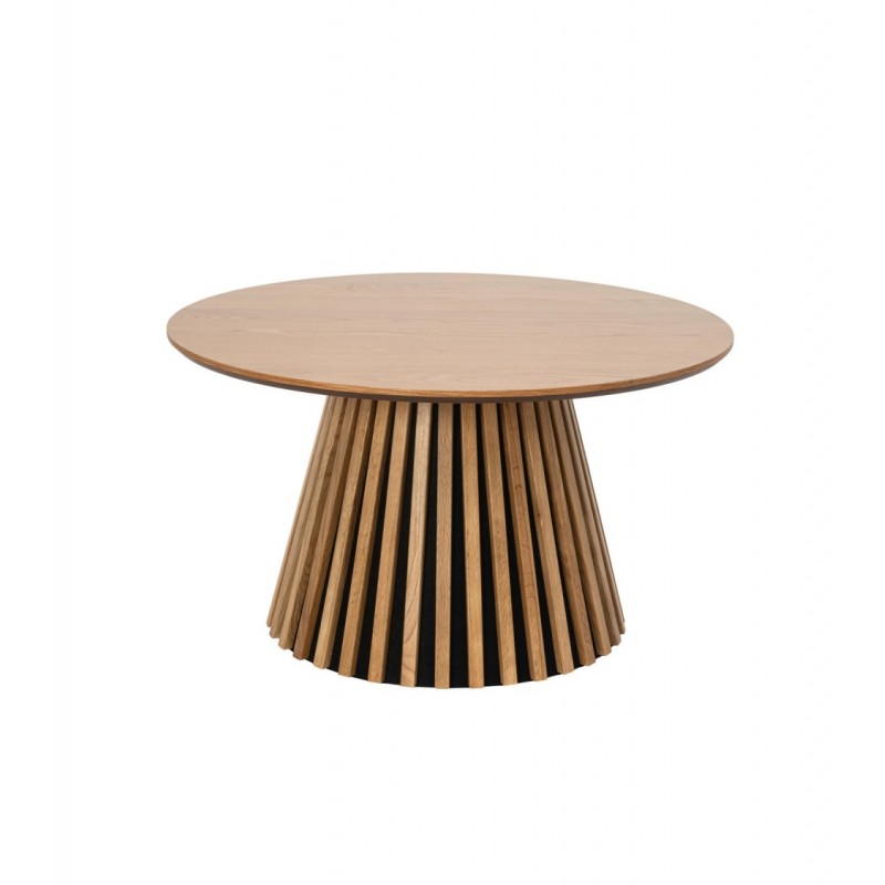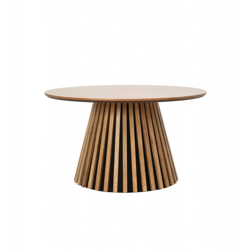 Stolik kawowy SVENDBORG to idealne rozwiązanie do każdego wnętrza w stylu skandynawskim, gdzie mebel ten dzięki swojej strukturze doda przestrzeni charakteru i naturalnego wykończenia. Został wykonany z wysokiej jakości materiałów, takich jak płyta MDF z dekorem drewnianym zapewniający trwałość i elegancki wygląd. Powierzchnie wykończono naturalnym olejem, który nadaje ciepła i wyrafinowania każdemu wnętrzu harmonijnie komponując się z różnymi stylami aranżacji. Duży praktyczny blat wykonano z płyty MDF oklejonej imitacją dębu w kolorze naturalnym, który został w całości osadzony na solidnej okrągłej podstawie w formie listew przypominających podłużne pionowe lamele. Bez wątpienia wyróżnia się swoją wyrazistością poprzez zachowanie na nim oryginalnych słoi, sęków oraz naturalności drewna co sprawia, że wygląda zjawiskowo, nadając każdemu wnętrzu oryginalnego charakteru elegancji i nowoczesności. Ogromną zaletą jest nie tyle funkcjonalność jak również duża wytrzymałość oraz łatwość czyszczenia, która wyróżniają się swoją naturalnością, kolorem oraz strukturą sprawiając przy tym, że każdy egzemplarz jest unikatowy. Efekt końcowy połączenia blatu oraz podstawy z płyty MDF jest jednolity, dzięki czemu całość mebla stanie się wspaniałą dekoracją, która doda wnętrzu nowoczesnego wykończenia oraz niesamowitego wyglądu. Jego zjawiskowa forma dopełni wnętrza w stylu nowoczesnym, boho, a nawet rustykalnym gdzie będzie zachwycał pięknym wykończeniem.