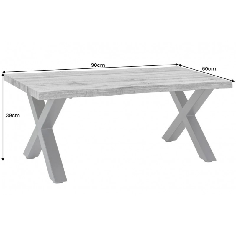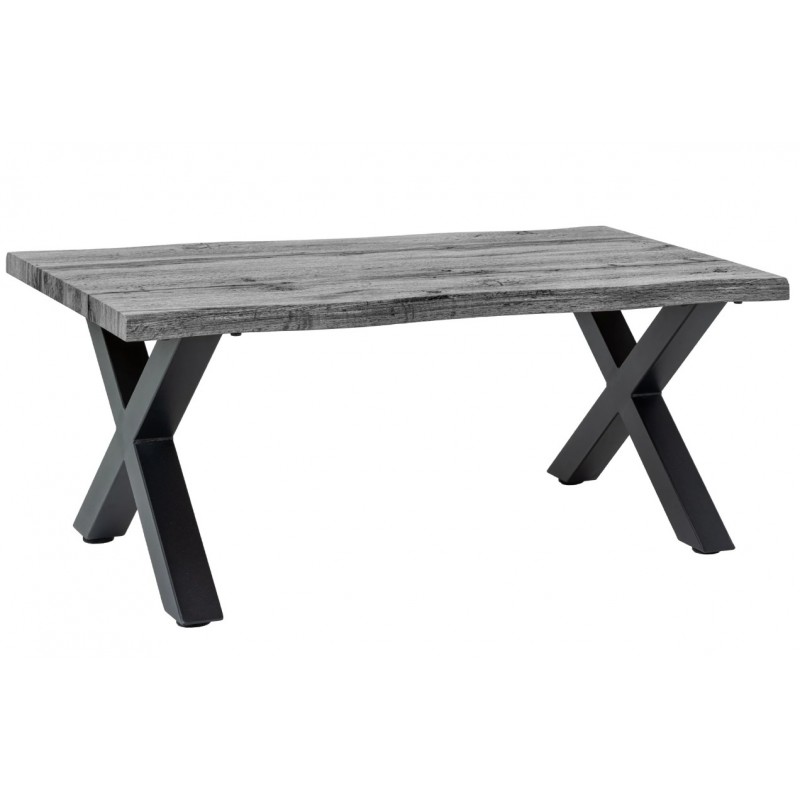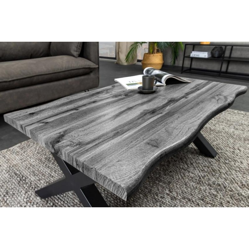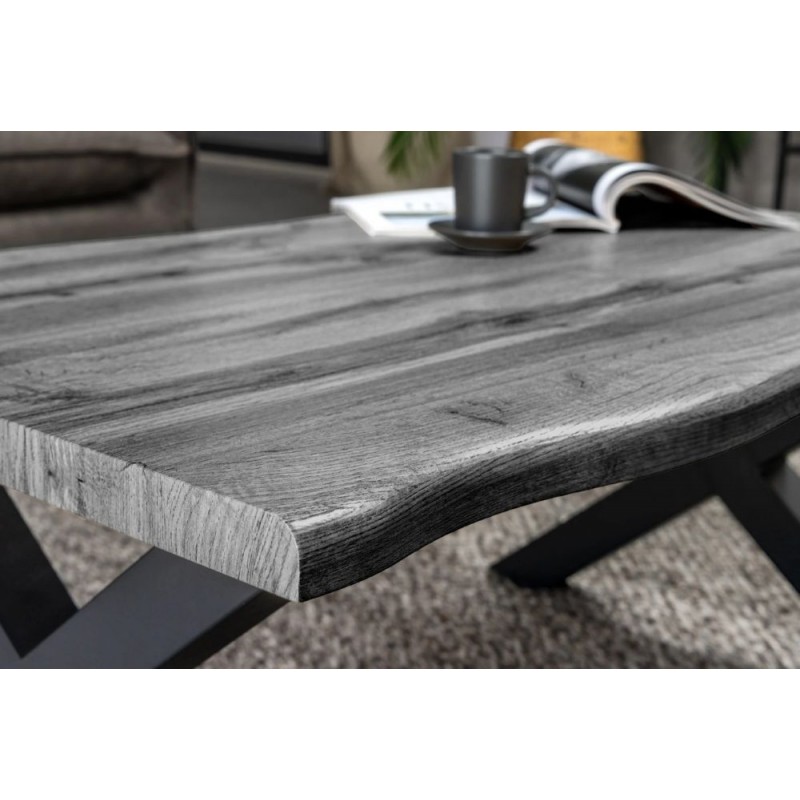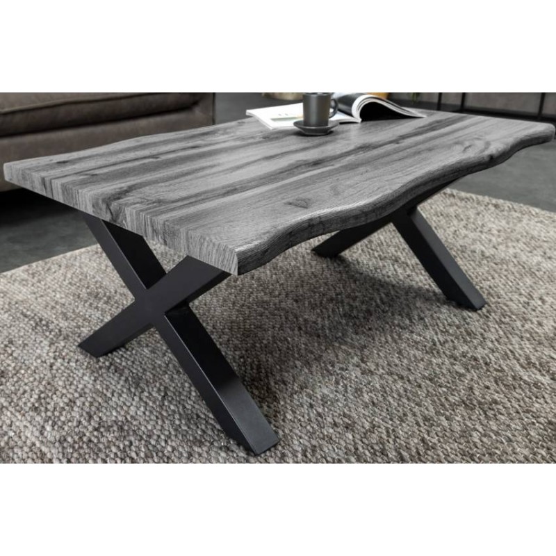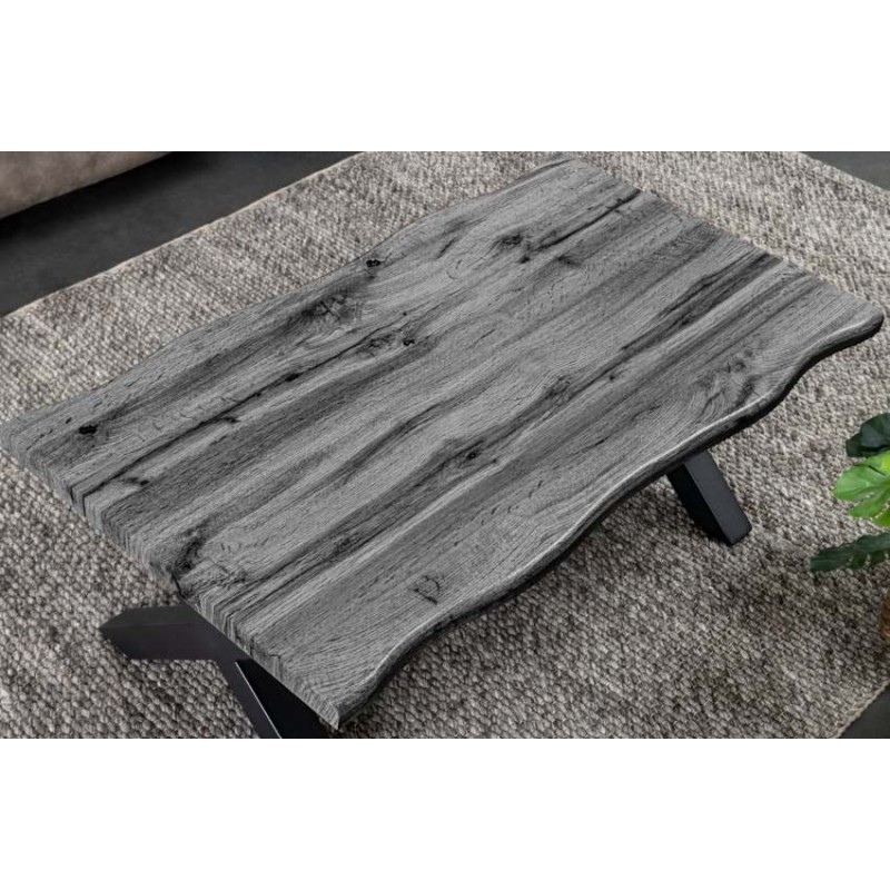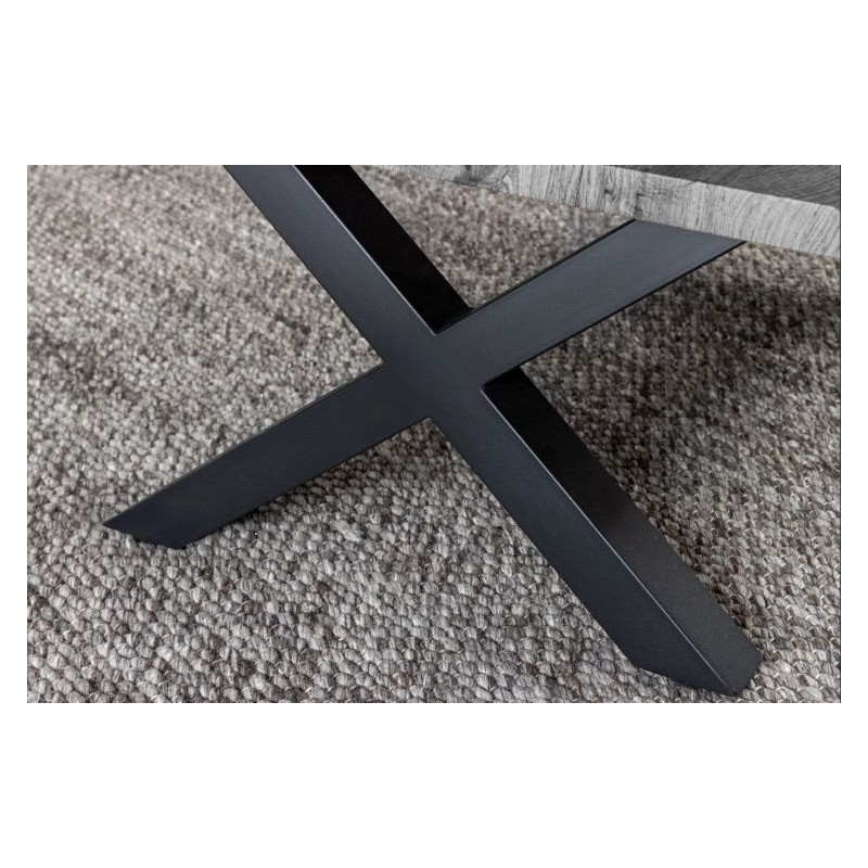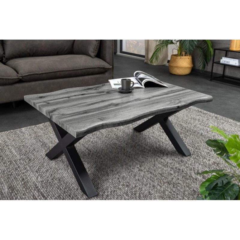 Ten nowoczesny stolik kawowy to idealne rozwiązanie do salonu w stylu nowoczesnym, któremu doda naturalności oraz spokoju, a dzięki swojej wyjątkowej formie przykuje uwagę każdego. Postawiony został na solidnej, stabilnej czarnej metalowej podstawie w kształcie litery X. Duży praktyczny oraz funkcjonalny blat o grubości 3 cm, wykonano z płyty MDF, która dla nadania wyrazistości tego stołu została oklejona w taki sposób, aby zachować autentyczność wyglądu dzikiego szarego dębu. Mebel ten dzięki odwzorcowaniu oryginalności słojów, sęków oraz naturalnej krawędzi drzewa prezentuje się zjawiskowo. Efekt końcowy połączenia wyglądu drewna oraz czarnej metalowej podstawy jest fenomenalny dzięki czemu idealnie sprawdzi się zarówno w salonach w stylu industrialnym jak i nowoczesnym. Stolik ten odnajdzie się znakomicie w każdym przestronnym salonie gdzie bez wątpienia stanie się nie tylko funkcjonalnym meblem, ale także przepiękną dekoracją dodającą wnętrzu niesamowitego wyglądu.
