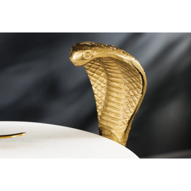 Stolik kawowy WILDLIFE COBRA to wyjątkowy mebel, który stanie się prawdziwą ozdobą każdego nowoczesnego wnętrza. Jego niezwykła forma przyciąga wzrok i nadaje aranżacji niepowtarzalnego charakteru. Największe wrażenie robi zjawiskowa podstawa stolika wykonana z aluminium w odcieniu złotym, która swoim kształtem przypomina wijącego węża cobra. To właśnie ten detal czyni mebel absolutnie unikalnym i artystycznym elementem wystroju. Na efektownej podstawie osadzony został okrągły marmurowy blat, którego powierzchnię zdobią subtelne, szare i beżowe nitki, nadające mu wyjątkowej lekkości oraz charakteru. Połączenie metalu oraz marmuru tworzy spójną, luksusową całość, która świetnie komponuje się z wyrafinowanymi aranżacjami. Bez wątpienia sprawdzi się idealnie w salonach urządzonych w stylu glamour jak i nowoczesnym, gdzie stanie się nie tylko funkcjonalnym dodatkiem, ale także przepiękną dekoracją nadającą niesamowitego wyglądu oraz charakteru.