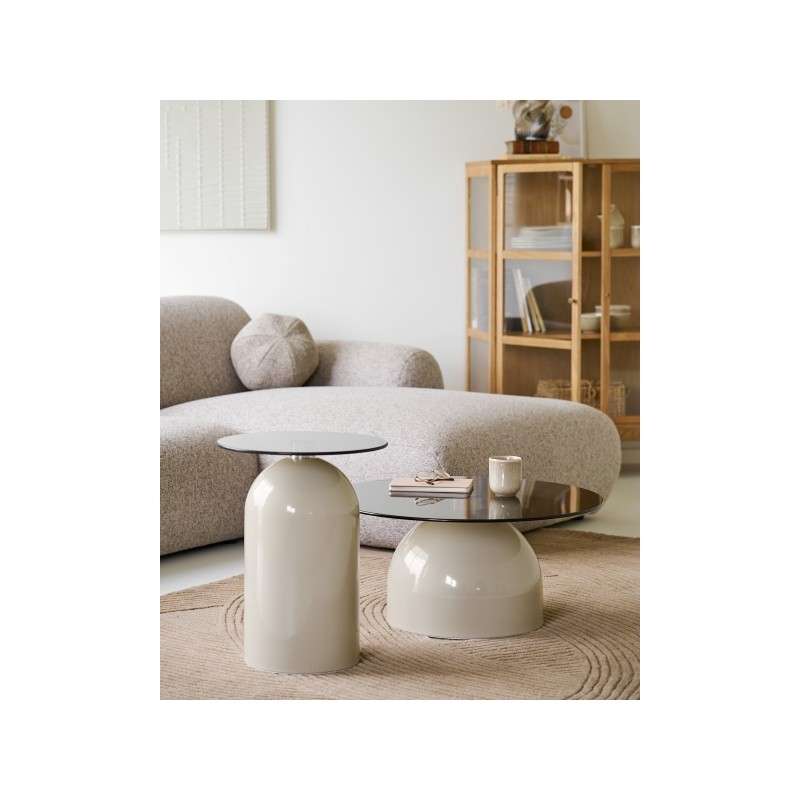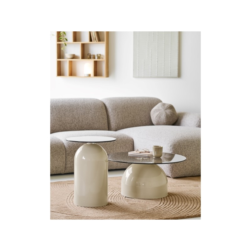 Stolik pomocniczy stanowi mniejszą wersję stolika kawowego z tej samej kolekcji, zachowując jego nowoczesny charakter i eleganckie wykończenie. Połączenie hartowanego szkła z metalową konstrukcją w odcieniach szarości i beżu tworzy spójną, stylową całość, idealną do współczesnych wnętrz.