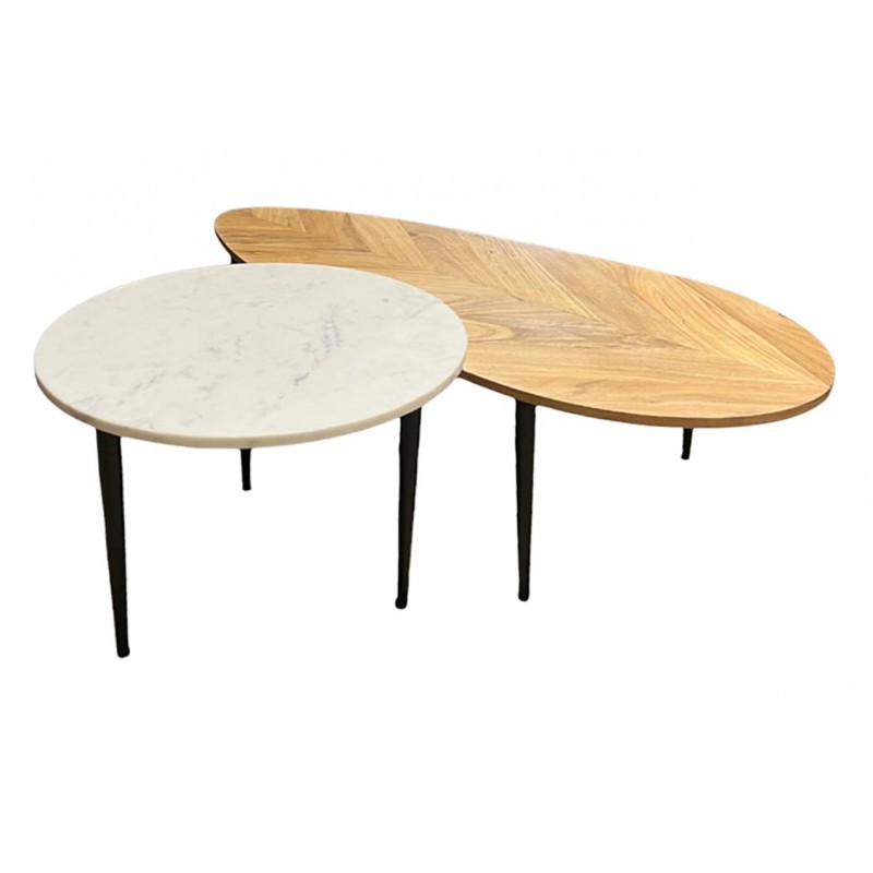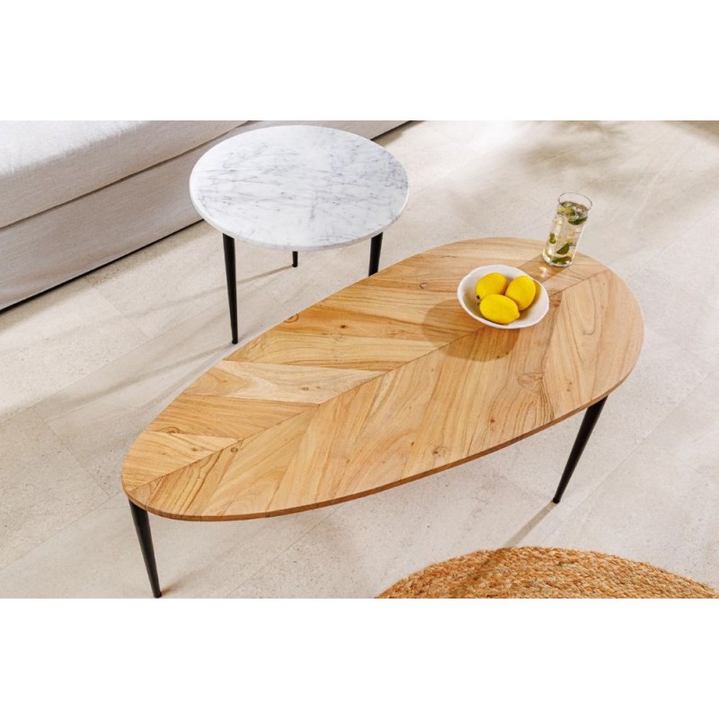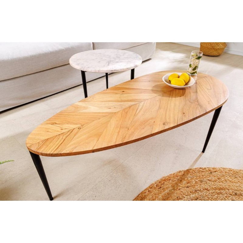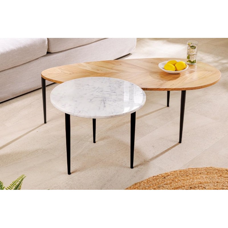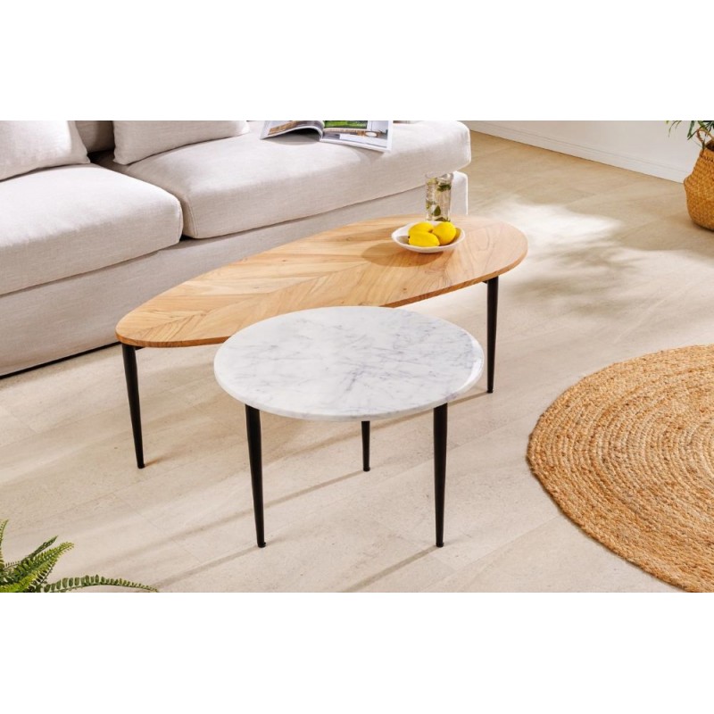 Ten wyjątkowy zestaw stolików kawowych to idealne rozwiązanie do nowoczesnych wnętrz, w których liczy się zarówno styl, jak i funkcjonalność. Różnorodność form i materiałów blatów nadaje mu unikatowego charakteru. Większy, owalny stolik wykonano z litego drewna akacji o ciepłym, naturalnym odcieniu, zdobionym dekoracyjnym wzorem jodełki. Mniejszy stolik posiada okrągły blat z białego marmuru, ozdobiony charakterystycznymi delikatnymi nitkami w odcieniach szarości, które tworzą niepowtarzalny wygląd. Oba osadzono na solidnej czarnej metalowej podstawie z trzema smukłymi nogami, zapewniającymi im stabilność i trwałość. Bez wątpienia dodatkowym atutem mebla jest możliwość ustawiania stolików ze sobą w dowolny pasujący sposób, razem jak również każdy z osobna, przez co dzięki ich funkcjonalności po zsunięciu zajmują bardzo mało miejsca. Widoczna struktura drewna akacji, zachowanie naturalnych słojów i sęków, w połączeniu z elegancją marmuru idealnie kontrastującą z czernią podstawy sprawia że efekt końcowy jest fenomenalny. Mebel ten sprawdzi się znakomicie w każdym salonie w stylu nowoczesnym dodając przestrzeni niesamowitego charakteru, stając się jednocześnie wyjątkową dekoracją oraz praktycznym elementem wnętrza.