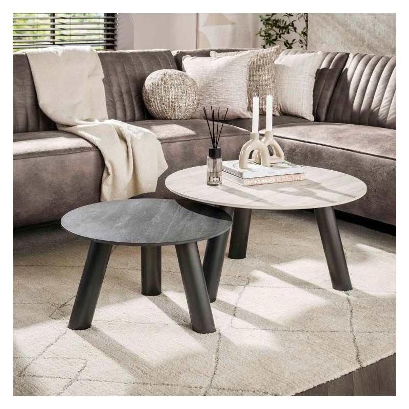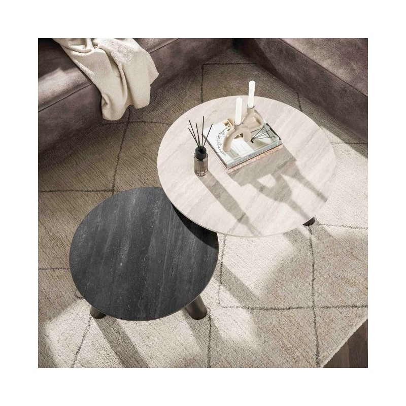Ten wyjątkowy zestaw stolików kawowych został wykonany z ceramiki o kamiennym wyglądzie, który zachwyca oryginalnym kolorem oraz wzorem. Naturalna estetyka blatów sprawia, że doskonale dopasowuje się do każdego rodzaju wnętrza. Stoliki posiadają okrągłe blaty osadzone na smukłej, czarnej metalowej podstawie, która nadaje im lekkości i nowoczesnego charakteru. Mebel wyróżnia się wyrazistym zestawieniem kolorów blatów dzięki zastosowaniu dekoracji inspirowanej naturalnym trawertynem. Dwa stylowe odcienie jasnoszary i ciemnoszary nadają całości głębi oraz eleganckiego, nowoczesnego kontrastu. Jaśniejszy blat łączy subtelne szarości z delikatnymi, nieregularnymi charakterystycznymi nitkami, natomiast ciemniejszy zachwyca głęboką antracytową tonacją z wyraźnymi, naturalnymi przebarwieniami. Dodatkowym atutem mebla jest bez wątpienia różnica wysokości, która sprawia, że oba stoliki mogą być ustawiane ze sobą w dowolny pasujący sposób jak również każdy z osobna, a dzięki ich funkcjonalności po zsunięciu razem zajmują bardzo mało miejsca. Połączenie dwóch kontrastujących kolorów blatów z czarną podstawą tworzy niezwykle efektowną i elegancką całość. Dzięki swojej wyrazistej formie stoliki bez wątpienia dodadzą wnętrzu charakteru i elegancji, doskonale wpisując się zarówno w aranżacje nowoczesne jak i klasyczne.