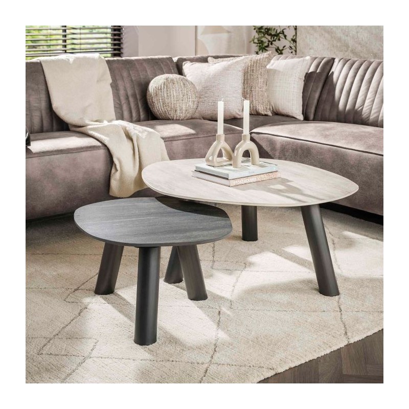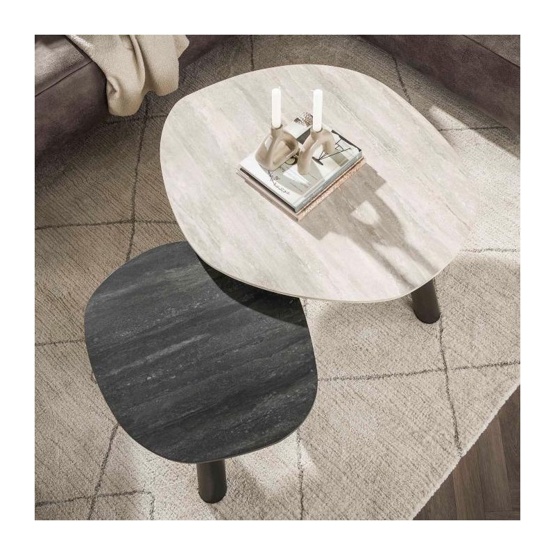 Ten wyjątkowy zestaw stolików kawowych został wykonany z ceramiki o kamiennym wyglądzie, który zachwyca oryginalnym kolorem oraz wzorem. Naturalna estetyka blatów sprawia, że doskonale dopasowuje się do każdego rodzaju wnętrza. Stoliki posiadają owalne blaty osadzone na smukłej, czarnej metalowej podstawie, która nadaje im lekkości i nowoczesnego charakteru. Mebel wyróżnia się wyrazistym zestawieniem kolorów blatów dzięki zastosowaniu dekoracji inspirowanej naturalnym trawertynem. Dwa stylowe odcienie jasnoszary i ciemnoszary nadają całości głębi oraz eleganckiego, nowoczesnego kontrastu. Jaśniejszy blat łączy subtelne szarości z delikatnymi, nieregularnymi charakterystycznymi nitkami, natomiast ciemniejszy zachwyca głęboką antracytową tonacją z wyraźnymi, naturalnymi przebarwieniami. Dodatkowym atutem mebla jest bez wątpienia różnica wysokości, która sprawia, że oba stoliki mogą być ustawiane ze sobą w dowolny pasujący sposób jak również każdy z osobna, a dzięki ich funkcjonalności po zsunięciu razem zajmują bardzo mało miejsca. Połączenie dwóch kontrastujących kolorów blatów z czarną podstawą tworzy niezwykle efektowną i elegancką całość. Dzięki swojej wyrazistej formie stoliki bez wątpienia dodadzą wnętrzu charakteru i elegancji, doskonale wpisując się zarówno w aranżacje nowoczesne jak i klasyczne.