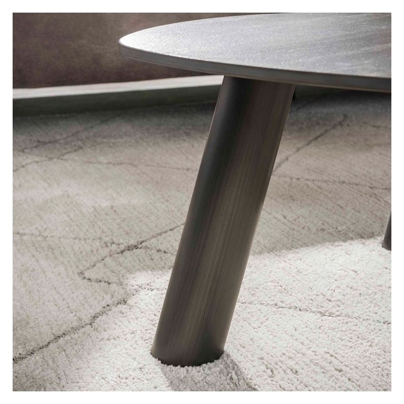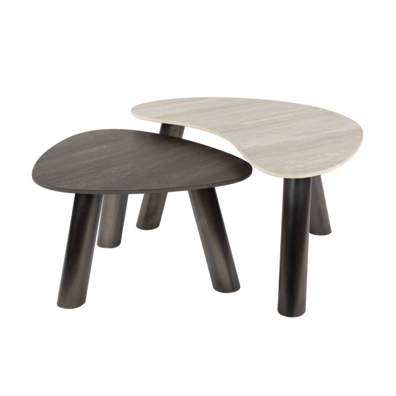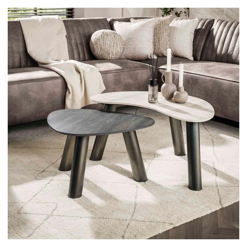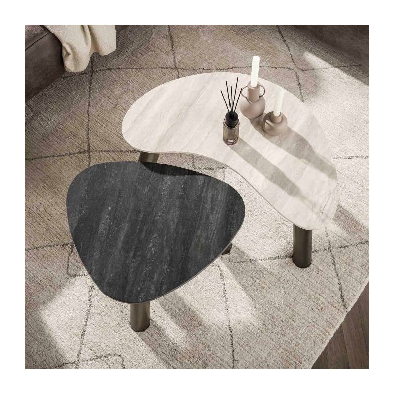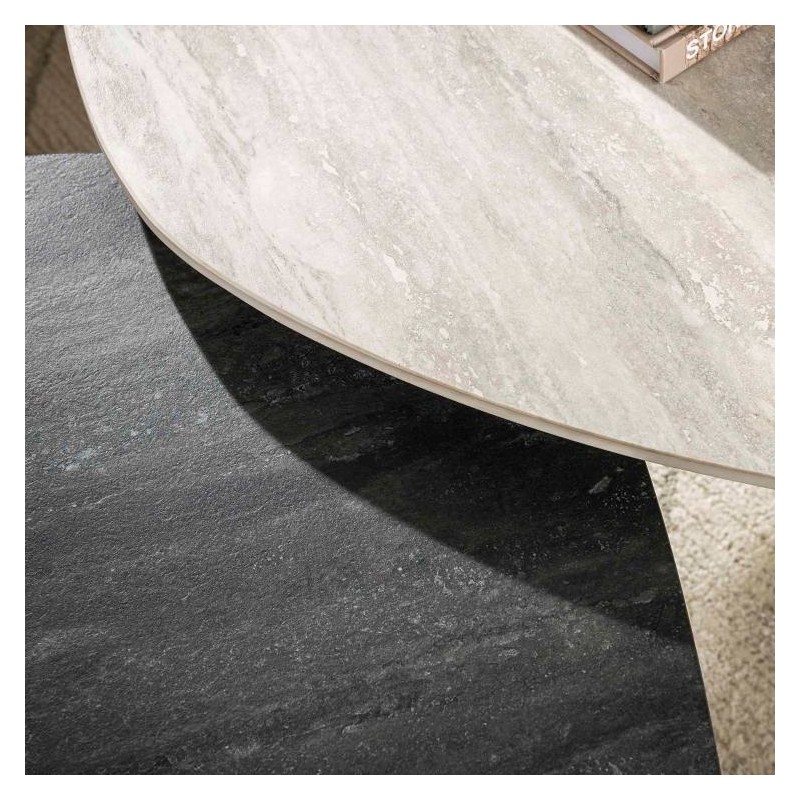 Ten wyjątkowy zestaw stolików kawowych został wykonany z ceramiki o kamiennym wyglądzie, który zachwyca oryginalnym kolorem oraz wzorem. Naturalna estetyka blatów sprawia, że doskonale dopasowuje się do każdego rodzaju wnętrza. Stoliki posiadają blaty o geometrycznych kształtach jeden owalny, a drugi w formie charakterystycznej nerki, które osadzono na smukłej, czarnej metalowej podstawie nadającej im lekkości i nowoczesnego charakteru. Mebel wyróżnia się wyrazistym zestawieniem kolorów blatów dzięki zastosowaniu dekoracji inspirowanej naturalnym trawertynem. Dwa stylowe odcienie jasnoszary i ciemnoszary nadają całości głębi oraz eleganckiego, nowoczesnego kontrastu. Jaśniejszy łączy subtelne szarości z delikatnymi, nieregularnymi charakterystycznymi nitkami, natomiast ciemniejszy zachwyca głęboką antracytową tonacją z wyraźnymi, naturalnymi przebarwieniami. Dodatkowym atutem mebla jest bez wątpienia różnica wysokości, która sprawia, że oba stoliki mogą być ustawiane ze sobą w dowolny pasujący sposób jak również każdy z osobna, a dzięki ich funkcjonalności po zsunięciu razem zajmują bardzo mało miejsca. Połączenie dwóch kontrastujących kolorów blatów z czarną podstawą tworzy niezwykle efektowną i elegancką całość. Dzięki swojej wyrazistej formie stoliki bez wątpienia dodadzą wnętrzu charakteru i elegancji, doskonale wpisując się zarówno w aranżacje nowoczesne jak i klasyczne.