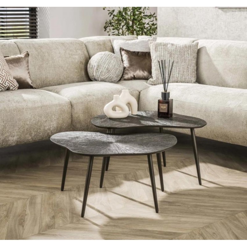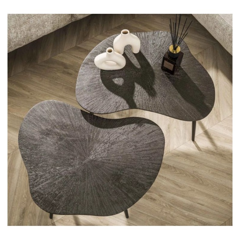 Zestaw stolików kawowych FADO to idealne rozwiązanie do każdego większego pomieszczenia w stylu nowoczesnym oraz industrialnym, gdzie zestaw ten dzięki swojej strukturze oraz wymiarom doda przestrzeni charakteru i unikatowego wykończenia. W skład zestawu wchodzą dwa stoliki o różnych wymiarach, co sprawia że każdy z nich jest unikatowy, a także zapewnia możliwość pełnej personalizacji i ustawiania elementów w dowolny sposób. Stoliki zostały osadzone na stabilnych podstawach składających się z czterech smukłych ciemnych metalowych nóg, co zapewnia im wyjątkową wytrzymałość i trwałość. Blaty stolików w odcieniu brązowym wykonane z płyty MDF stanowią wyjątkowość tego mebla, a zastosowany na ich powierzchni dekoracyjny wzór w formie promieni wykonywany jest za pomocą precyzyjnego frezowania ręcznego, dzięki czemu kusi swoją autentycznością oraz unikalnością. Zestaw stolików kawowych FADO sprawdzi się znakomicie w każdym salonie, gdzie stanie się nie tylko funkcjonalnym dodatkiem, ale także piękną dekoracją, która doda wnętrzu stylu oraz przykuje uwagę każdego.