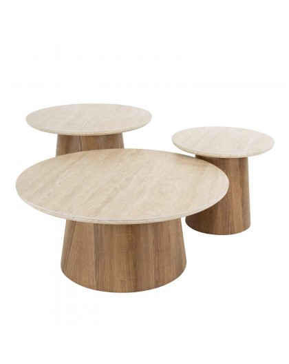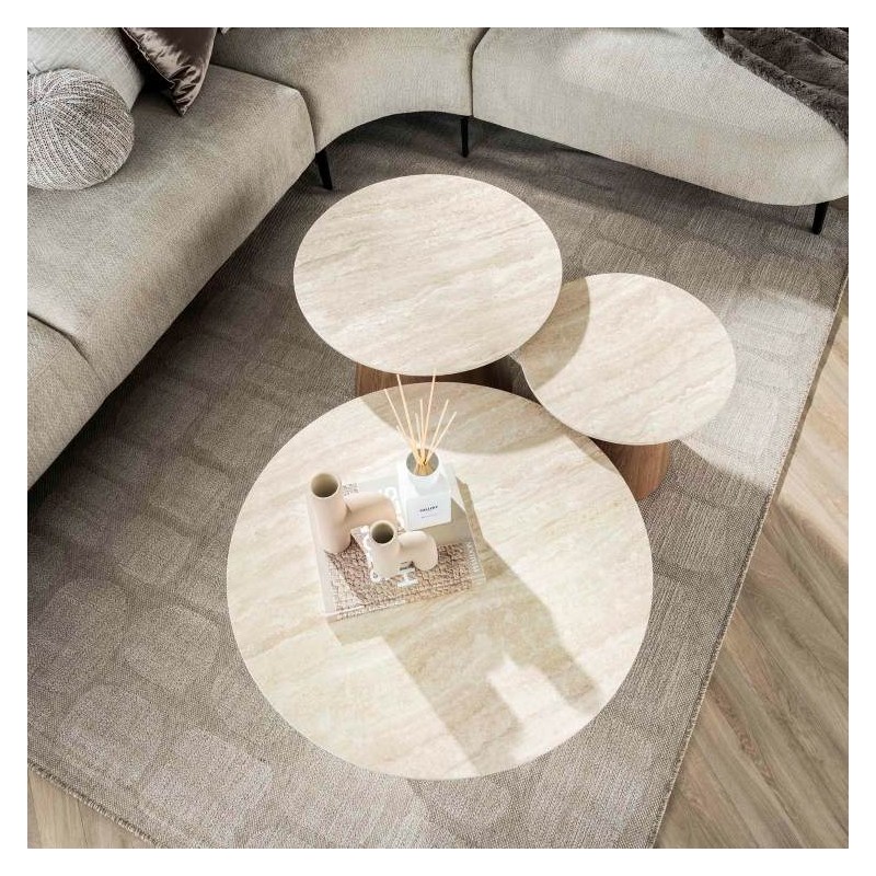 Zestaw stolików MORAJ to idealne rozwiązanie do każdego salonu urządzonego w stylu nowoczesnym, które doda naturalności i spokoju, a także dzięki swojej formie przykuje uwagę każdego. Blaty zostały wykonane z ceramiki w kolorze beżowym, których struktura podkreśla wyjątkowy charakter mebla. Wyróżniają się między innymi swoją wyrazistością poprzez zastosowanie w nich dekoracji w formie kamienia naturalnego o wyglądzie trawertynu, wraz z elegancką charakterystyczną kolorystyką oraz dopełniającymi odcieniami w jaśniejszych kolorach beżu. Głównym atutem bez wątpienia są geometryczne formy blatów, które zostały osadzone na stabilnych podstawach z płyty MDF pokrytej dekorem drewnianym, a dzięki zachowanej oryginalności zarówno słojów jak i sęków prezentują się bardzo naturalnie. Ich zaletą jest funkcjonalność, wytrzymałość oraz łatwość czyszczenia, wyróżniając się wyrazistością, kolorem i strukturą powodują jednocześnie, że każdy egzemplarz jest unikatowy. Efekt końcowy wykończenia i połączenia ceramiki oraz drewnianej podstawy jest fenomenalny sprawiając tym samym, że stoliki MORAJ sprawdzą się znakomicie w każdym nowoczesnym salonie, gdzie staną się nie tylko funkcjonalnym meblem, ale także przepiękną dekoracją.
