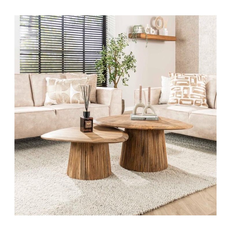 Te nietuzinkowe stoliki kawowe OSMAN to idealne meble pasujące do każdego nowoczesnego salonu, gdzie dzięki swojej ciekawej formie wprowadzą do wnętrza niesamowitego stylu. Blaty wykonano z litego drewna mango w piaskowym odcieniu, z delikatnie zaokrąglonymi i ściętymi krawędziami, co dodaje im subtelności i lekkości. Solidne podstawy stolików również powstały z drewna mango, a ich powierzchnię zdobią pionowe, podłużne listwy dekoracyjne przypominające lamele, które nadają całości nowoczesnego, designerskiego wyglądu. Każdy element zestawu został wykonany ręcznie, z najwyższą precyzją i dbałością o szczegóły, a naturalna struktura drewna z widocznymi sękami i słojami podkreśla autentyczność oraz unikalny charakter mebla. Różnorodność kształtów i wielkości blatów sprawia, że stoliki prezentują się niezwykle efektownie zarówno razem, jak i osobno. Mogą być ustawione ze sobą razem jak również każdy z osobna, przez co po zsunięciu ich razem idealnie do siebie pasują, zajmując przy tym bardzo mało miejsca. Zestaw stolików kawowych OSMAN sprawdzi się znakomicie w każdym salonie, gdzie stanie się nie tylko funkcjonalnym dodatkiem, ale także piękną dekoracją, która doda wnętrzu stylu oraz przykuje uwagę każdego.