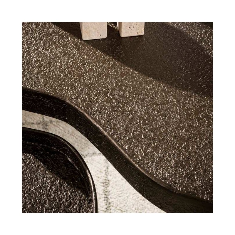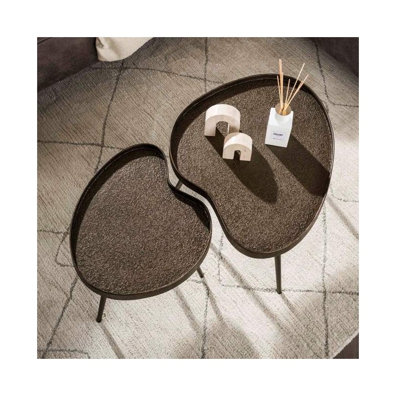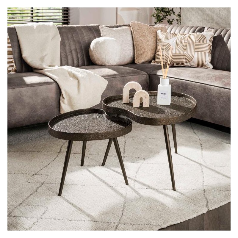 Stoliki kawowe TEY to bez wątpienia idealne rozwiązanie dla miłośników ciekawych form. Ten nietuzinkowy zestaw dzięki swoim geometrycznym kształtom oraz nietypowej strukturze, wprowadzi do wnętrza niesamowity styl. Stoliki posiadają blaty w kształcie nerki z podwyższonymi brzegami, które osadzono na solidnej, smukłej podstawie składającej się z trzech wysokich, metalowych nóg w brązowym kolorze. Blaty wykonano z płyty MDF pokrytej nietypową chropowatą strukturą w odcieniu brązu, która dodaje meblowi charakteru i oryginalnego wyglądu. Głównym atutem stolików jest ich nietypowy kształt oraz forma jak również możliwość ustawiania każdego z osobna jak i w dowolnie pasujący sposób sprawiając, że po ich zsunięciu zajmują bardzo mało miejsca. Stoliki kawowe TEY sprawdzą się znakomicie zarówno w salonie w stylu industrialnym jak i nowoczesnym, gdzie dodadzą przestrzeni wyrazistości stając się tym samym niesamowitą dekoracją oraz praktycznym elementem pomieszczenia.
