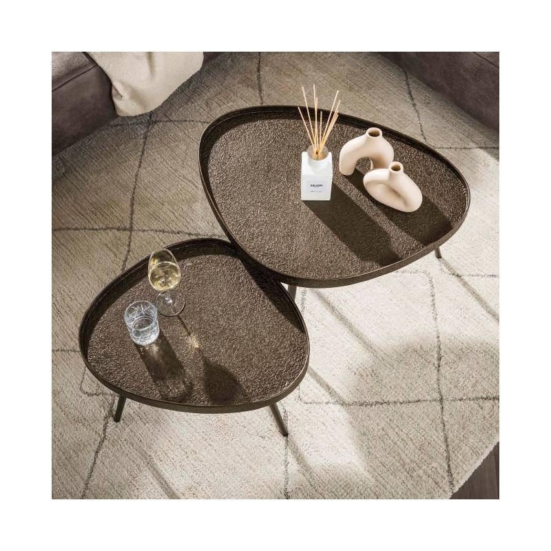 ZESTAW STOLIKÓW KAWOWYCH TEY BRĄZOWY - 2sztuki. Stoliki kawowe TEY to bez wątpienia idealne rozwiązanie dla miłośników ciekawych form. Ten nietuzinkowy zestaw dzięki swoim geometrycznym kształtom oraz nietypowej strukturze, wprowadzi do wnętrza niesamowity styl. Stoliki posiadają blaty w kształcie nerki z podwyższonymi brzegami, które osadzono na...
