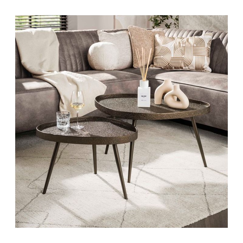 Stoliki kawowe TEY to bez wątpienia idealne rozwiązanie dla miłośników ciekawych form. Ten nietuzinkowy zestaw dzięki swoim geometrycznym kształtom oraz nietypowej strukturze, wprowadzi do wnętrza niesamowity styl. Stoliki posiadają blaty o trójkątnym kształcie z podwyższonymi brzegami, które osadzono na solidnej, smukłej podstawie składającej się z trzech wysokich, metalowych nóg w brązowym kolorze. Blaty wykonano z płyty MDF pokrytej nietypową chropowatą strukturą w odcieniu brązu, która dodaje meblowi charakteru i oryginalnego wyglądu. Głównym atutem stolików jest ich nietypowy kształt oraz forma jak również możliwość ustawiania każdego z osobna jak i w dowolnie pasujący sposób sprawiając, że po ich zsunięciu zajmują bardzo mało miejsca. Stoliki kawowe TEY sprawdzą się znakomicie zarówno w salonie w stylu industrialnym jak i nowoczesnym, gdzie dodadzą przestrzeni wyrazistości stając się tym samym niesamowitą dekoracją oraz praktycznym elementem pomieszczenia.
