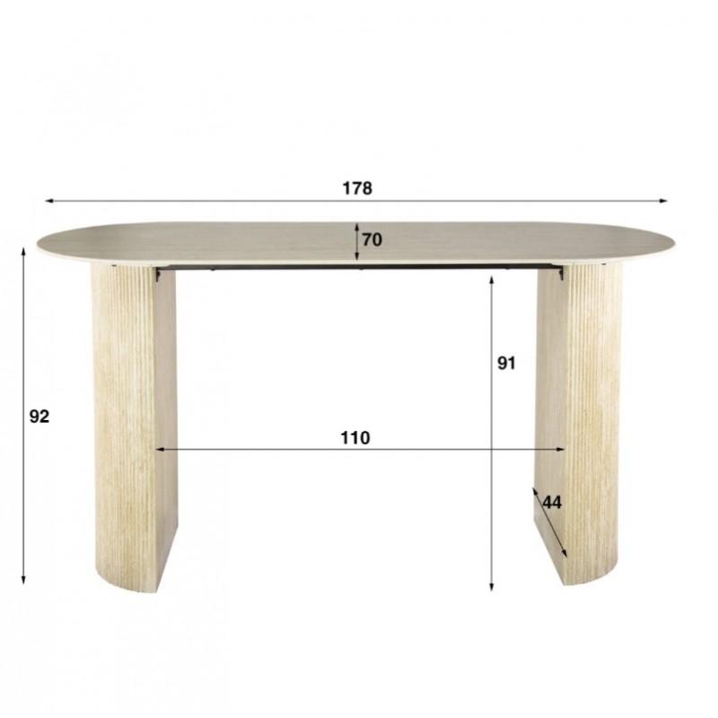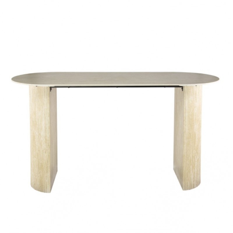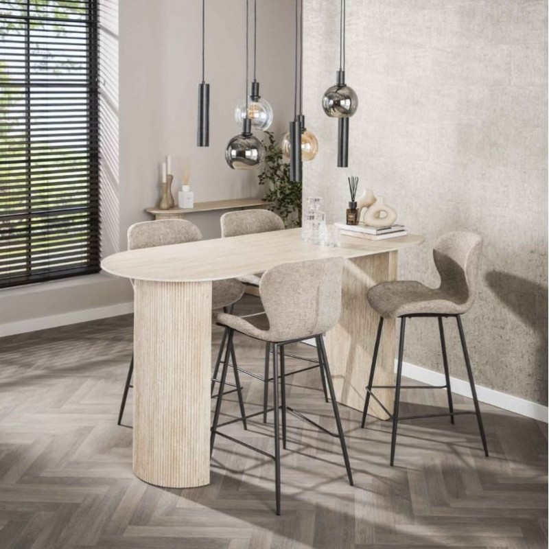 Stół barowy TIAGO to idealne rozwiązanie do każdego salonu oraz jadalni urządzonego stylu nowoczesnym, który doda naturalności i spokoju, a także dzięki swojej formie przykuje uwagę każdego. W blat został wykonany z ceramiki w kolorze beżowym, którego struktura podkreśla wyjątkowy charakter mebla. Wyróżnia się on między innymi swoją wyrazistością poprzez zastosowanie w nim dekoracji w formie kamienia naturalnego o wyglądzie trawertynu wraz z elegancką charakterystyczną kolorystyką oraz dopełniającymi odcieniami w jaśniejszych kolorach beżu. Głównym jego atutem bez wątpienia jest również geometryczna forma dużego owalnego blatu, osadzonego na stabilnej podstawie w formie dwóch kolumn z płyty MDF w kształcie półksiężyca z pionową dekoracją falistą w taki sposób aby ułożenia krzeseł podczas użytkowania nie stanowiło problemu. Zaletą tego stołu jest funkcjonalność, wytrzymałość oraz łatwość czyszczenia, dzięki czemu wyróżnia się swoją wyrazistością, kolorem i strukturą powodującą, że każdy egzemplarz jest unikatowy. Efekt końcowy wykończenia w całości w jasnych kolorach jest jednolity sprawiając tym samym, że stół barowy TIAGO sprawdzi się znakomicie w każdym nowoczesnym salonie oraz jadalni, gdzie stanie się nie tylko funkcjonalnym meblem, ale także przepiękną dekoracją.