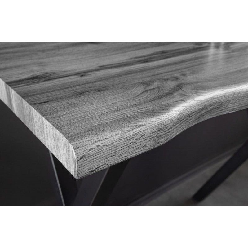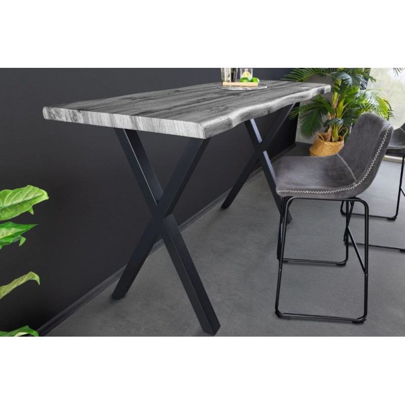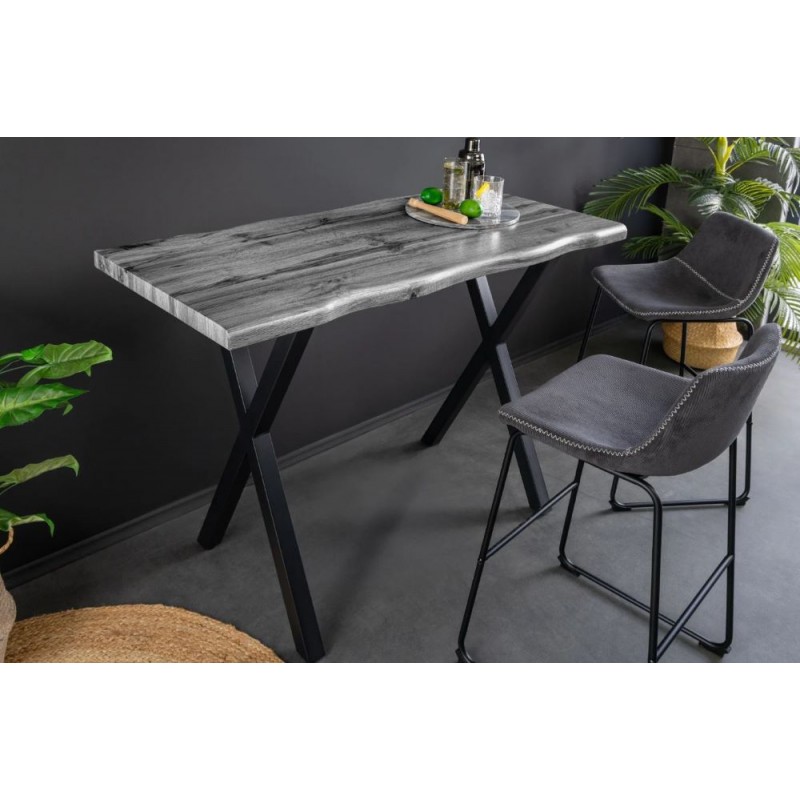 Stół barowy WILD to idealne rozwiązanie do wnętrz utrzymanych zarówno w stylu industrialnym jak i loftowym, który dzięki swojej formie wprowadza do pomieszczenia naturalne wykończenie oraz wyjątkowy charakter. Duży, efektowny blat o grubości 4 cm wykonano z wysokogatunkowej płyty MDF wykończonej melaminą w odcieniu dzikiego szarego dębu. Zastosowana okleina doskonale odwzorowuje naturalne krawędzie, usłojenie oraz strukturę drewna, nadając meblowi autentyczny, niepowtarzalny wygląd. Całość osadzono na stabilnej, czarnej metalowej podstawie w kształcie litery X, która gwarantuje solidność konstrukcji i podkreśla surowy, industrialny charakter stołu. Stół barowy WILD doskonale sprawdzi się zarówno w jadalni, jak i w przestronnych wnętrzach typu loft, stanowiąc efektowne połączenie nowoczesnego designu i naturalnego stylu.