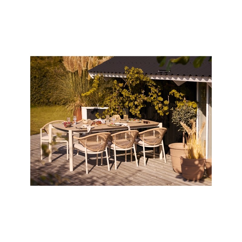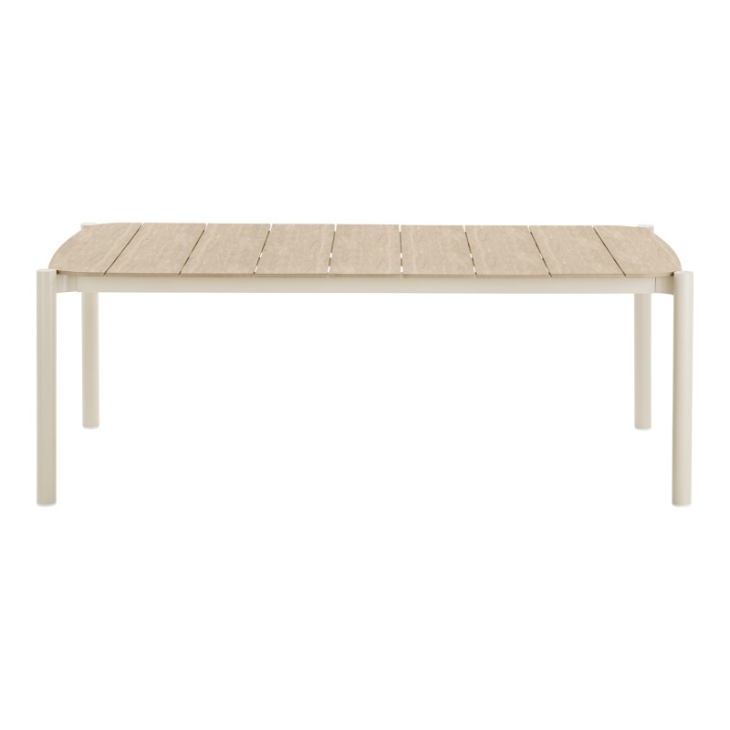 Ten stół łączy nowoczesny design z funkcjonalnością, tworząc idealne miejsce do spotkań na świeżym powietrzu. Lekki, a zarazem trwały stelaż z aluminium i blat wykonany z wysokiej jakości materiału imitującego drewno w piaskowo-naturalnym wykończeniu zapewnia odporność na codzienne użytkowanie i łatwe utrzymanie czystości. Duże wymiary stołu pozwalają wygodnie pomieścić od sześciu do ośmiu osób, co czyni go idealnym do wspólnych posiłków i relaksu w ogrodzie. Minimalistyczny design i stonowana kolorystyka harmonijnie wkomponują się w każdą aranżację ogrodową, tworząc przytulną i stylową przestrzeń na relaks oraz wspólne posiłki.