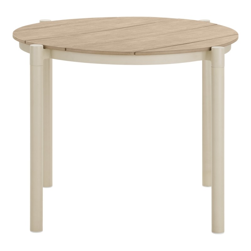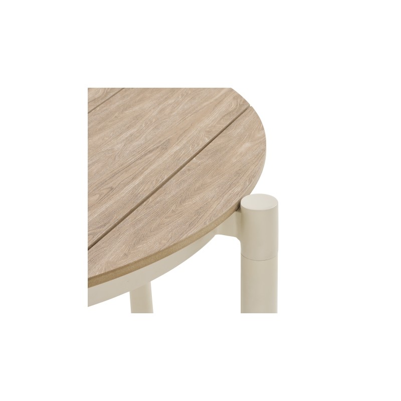 Ten stół łączy nowoczesny design z funkcjonalnością, tworząc idealne miejsce do spotkań na świeżym powietrzu. Lekki, a zarazem trwały stelaż z aluminium i blat wykonany z wysokiej jakości materiału imitującego drewno w piaskowo-naturalnym wykończeniu zapewnia odporność na codzienne użytkowanie i łatwe utrzymanie czystości. Kompaktowe wymiary stołu sprawiają, że wygodnie pomieści cztery osoby, a minimalistyczny design i stonowana kolorystyka harmonijnie wkomponują się w każdą aranżację ogrodową, tworząc przytulną i stylową przestrzeń na relaks oraz wspólne posiłki.