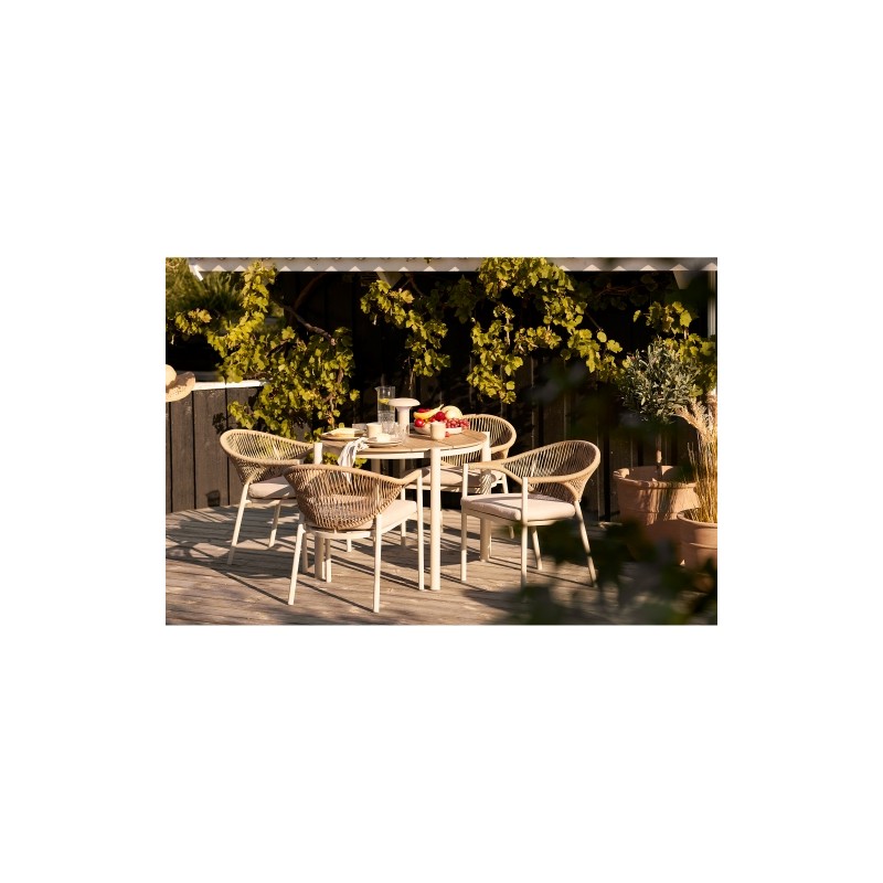 Umebluj taras lub patio w klasycznym stylu, który nigdy nie wychodzi z mody! Stół jadalny Togo ma blat z drewna tekowego i białe aluminiowe podwozie. Projekt ma wpływy ze Skandynawii z prostymi, zwiewnymi kształtami. Tutaj otrzymujesz neutralny i uroczy stół jadalny, który pasuje do większości stylów. Stwórz swój zestaw, wybierając rodzaj krzeseł...