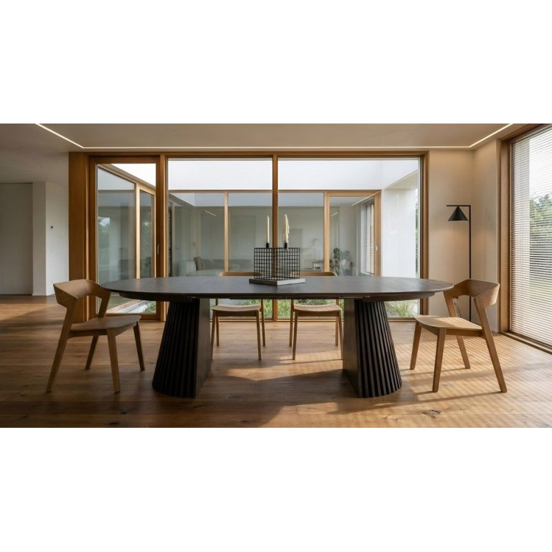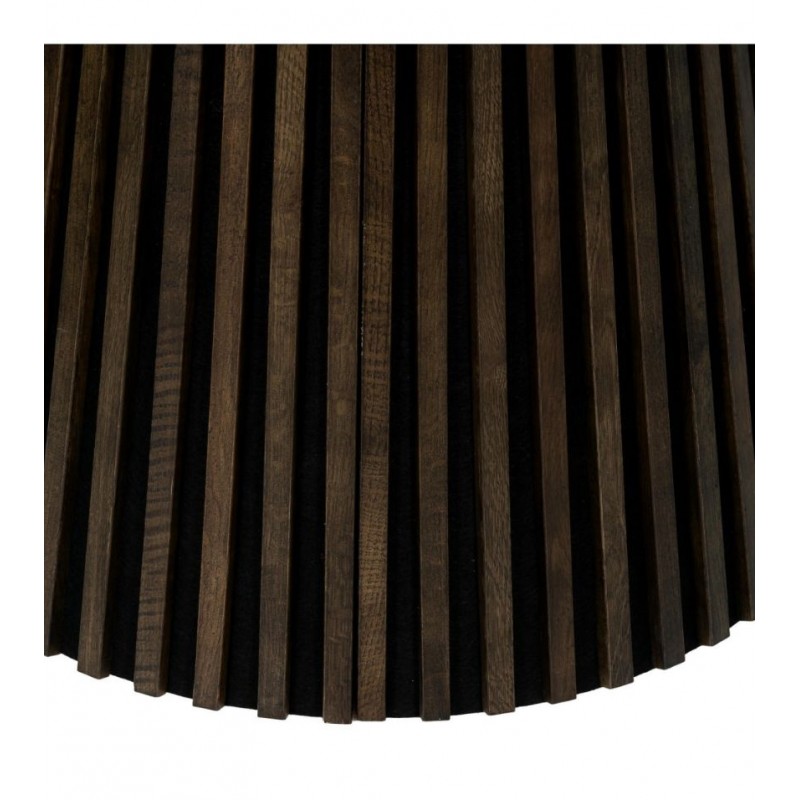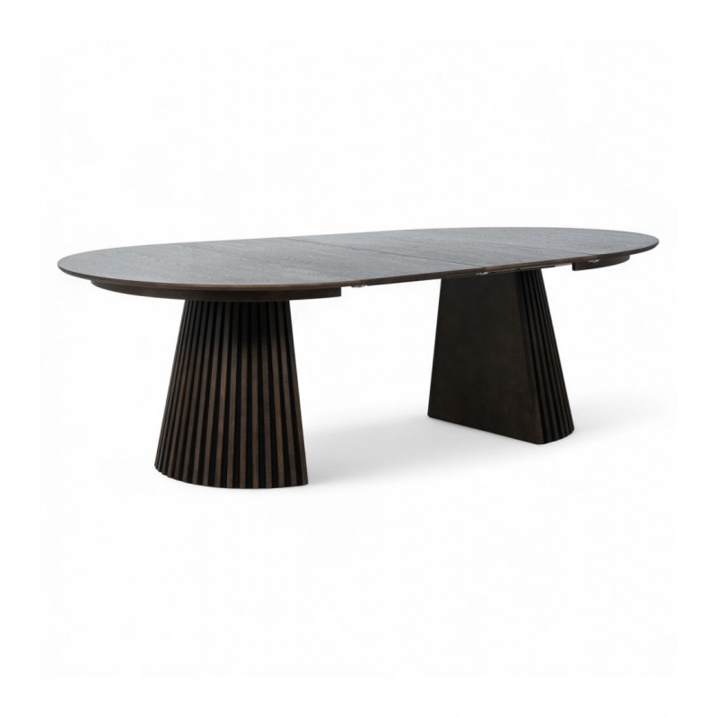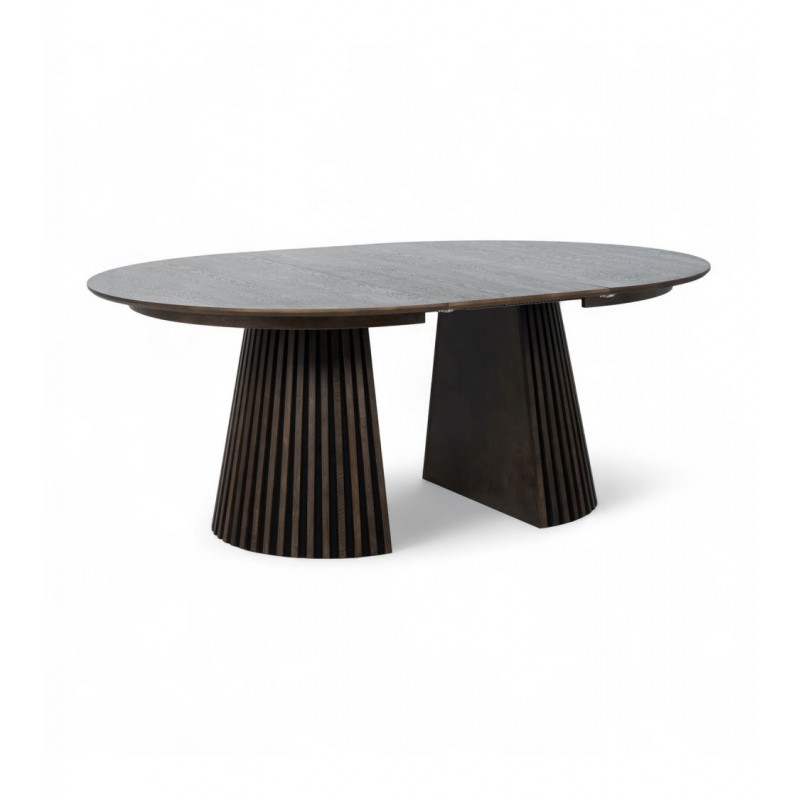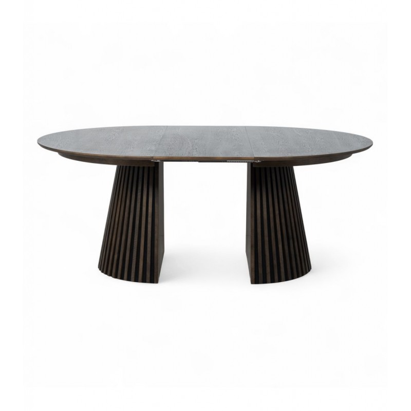 Ten robiący ogromne wrażenie okrągły rozkładany stół SVENDBORG, to idealne rozwiązanie do każdego salonu czy jadalni w stylu nowoczesnym, który dodaje przestrzeni niesamowitego stylu oraz klasy. Duży praktyczny blat został wykonany z płyty MDF z dekorem drewnianym oklejonym imitacją przydymionego dębu w kolorze brązowym. Cechą szczególną tego stołu jest łatwa i szybka możliwość zmienienia jego kształtu z okrągłej na owalną, powiększając go za pomocą przedłużek do dogodnie odpowiedniej szerokości. Blat ten został w całości osadzony na solidnej okrągłej podstawie w formie listew przypominających podłużne pionowe lamele, które w momencie rozłożenia go rozdzielają się na dwie półokrągłe podstawy. Bez wątpienia wyróżnia się swoją wyrazistością poprzez zachowanie na nim oryginalnych słoi, sęków oraz naturalności drzewa co sprawia, że wygląda zjawiskowo, nadając każdemu wnętrzu oryginalnego charakteru elegancji i nowoczesności. Ogromną zaletą jest nie tyle funkcjonalność jak również duża wytrzymałość oraz łatwość czyszczenia, która wyróżniają się swoją naturalnością, kolorem oraz strukturą sprawiając przy tym, że każdy egzemplarz stołu jest unikatowy. Efekt końcowy połączenia blatu z płyty MDF oraz podstawy jest jednolity, dzięki czemu całość mebla stanie się wspaniałą dekoracją, która doda wnętrzu nowoczesnego wykończenia oraz niesamowitego wyglądu. Jego zjawiskowa forma dopełni wnętrza w stylu nowoczesnym, boho, a nawet rustykalnym gdzie będzie stanowił centrum pomieszczenia zachwycając najmniejszymi detalami oraz pięknym wykończeniem.