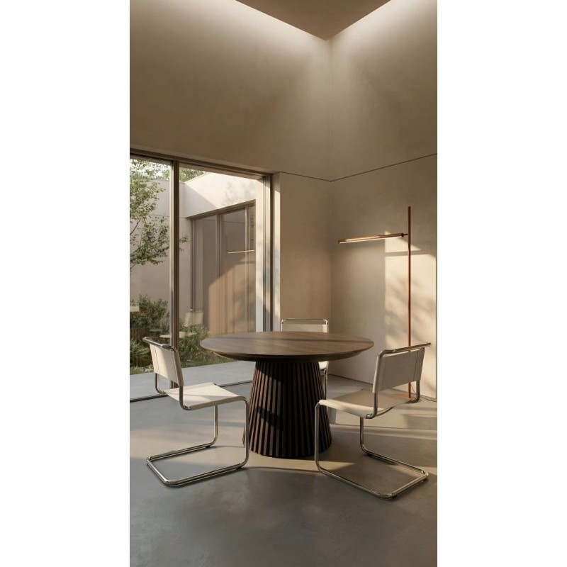 Okrągły stół jadalny jest idealny do tworzenia towarzyskich i zachęcających momentów przy każdym posiłku - tutaj nikt nie znajdzie się na krawędzi! Kaseidon ma nowoczesny orzechowy kolor, który ładnie pasuje do nowoczesnego domu. Okrągły blat stołu ma matowe wykończenie, a nogi są lekko rozszerzone ze stabilizującą ramą, konsekwentnie wykonaną z płyty MDF...